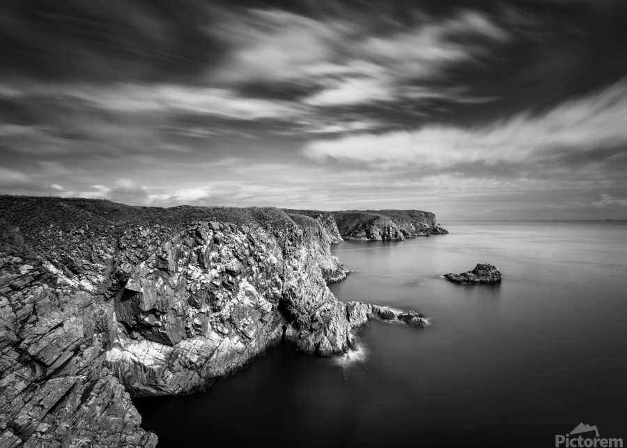 A long exposure image of the Bullers of Buchan headland in Aberdeenshire Scotland where cliffs drop steeply into the North Sea and dramatic clouds move swiftly overhead. The slow motion of the sky contrasts with the rugged unmoving coastline creating a moody and atmospheric scene. A great photograph for those who are drawn to Scotland’s wild seascapes and the quiet power of remote coastal places.