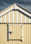 A yellow and white wooden beach hut on Hunstanton beach Norfolk shown against a blue sky with scattered cloud. The view frames a single window with shutter closed and a section of the roof end capturing the crisp detailing and neat finish of this traditional seaside structure. A great photograph for those drawn to the charm simplicity and character of English coastal architecture.
