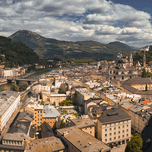 A panoramic view of Salzburg Austria with the Salzach River winding through the sunlit city in the foreground. In the distance the Hohensalzburg Fortr...[+]