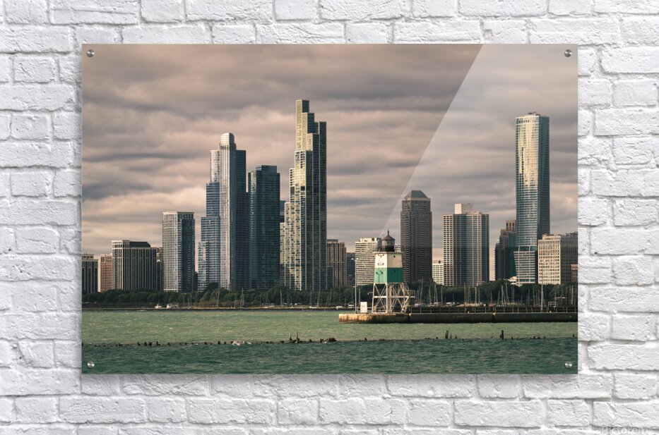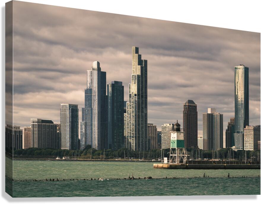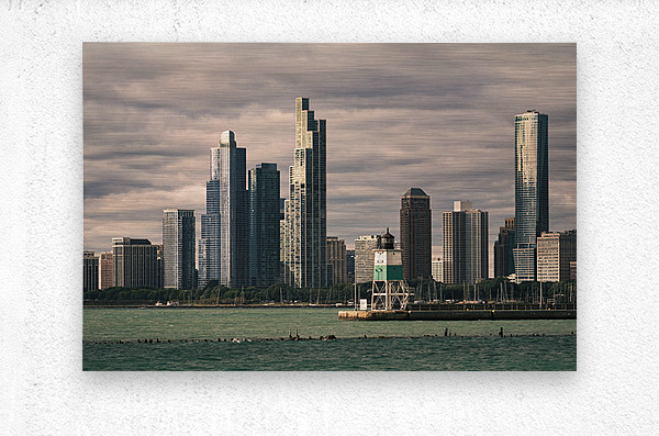 The Chicago waterfront as seen from Navy Pier with the city skyline rising against a backdrop of low textured clouds. The buildings appear almost sculptural beneath the weight of the sky while the water in the foreground adds a sense of space and stillness. A great photograph for anyone drawn to urban landscapes with atmosphere and depth.