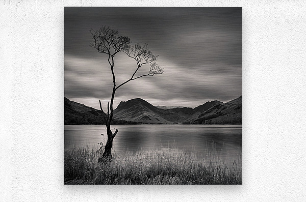 A lone tree stands on the shoreline of Buttermere lake in the Lake District its branches reaching quietly toward an overcast sky. The muted tones and soft light create a calm reflective mood capturing the peaceful solitude of this iconic English landscape. A great photograph for those drawn to tranquil natural scenes and the gentle beauty of the Lakes.