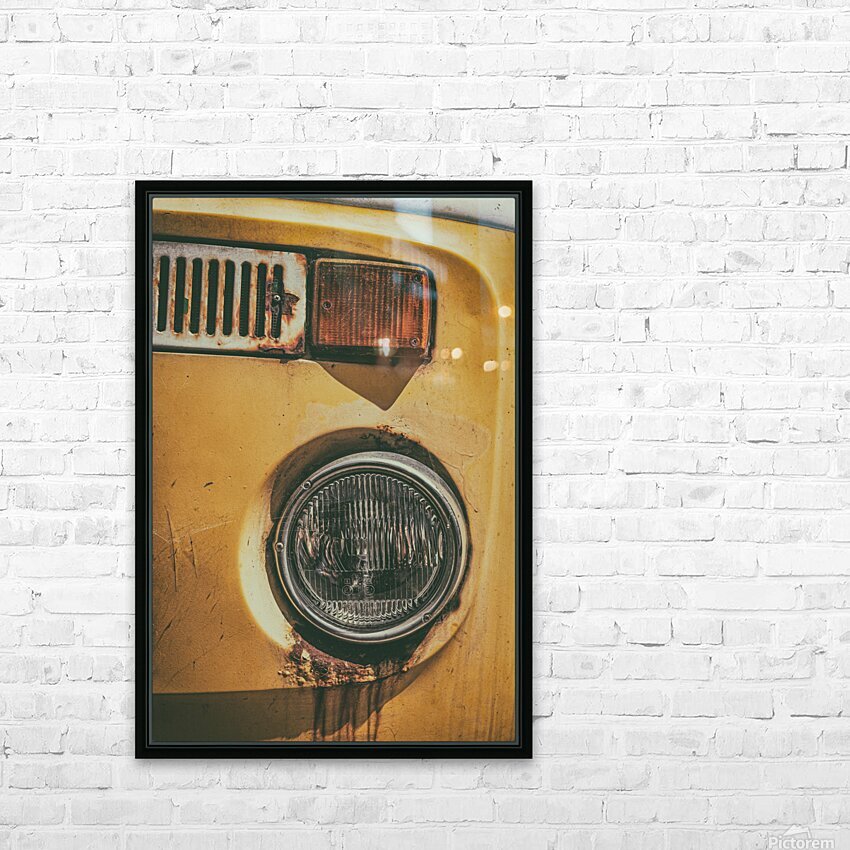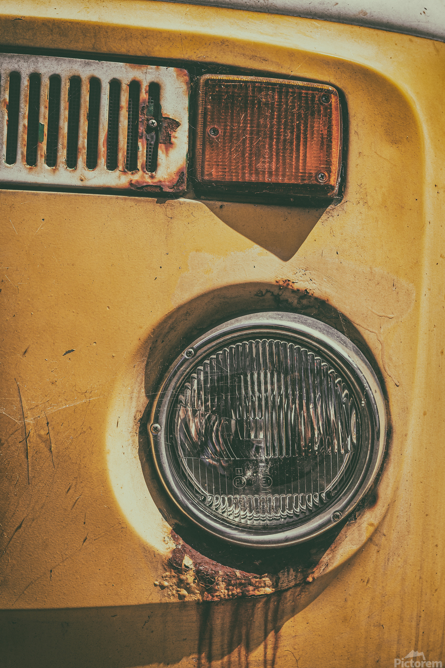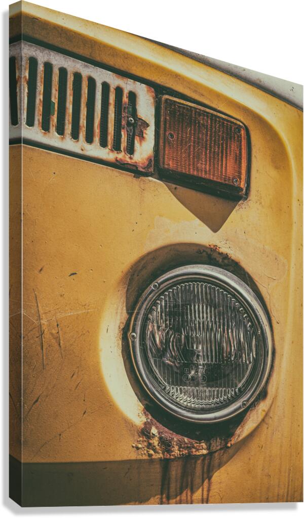 The front section of an abandoned yellow VW T2 campervan its headlight streaked with rust that trails down like tears. Time has worn the metal and dul...[+]