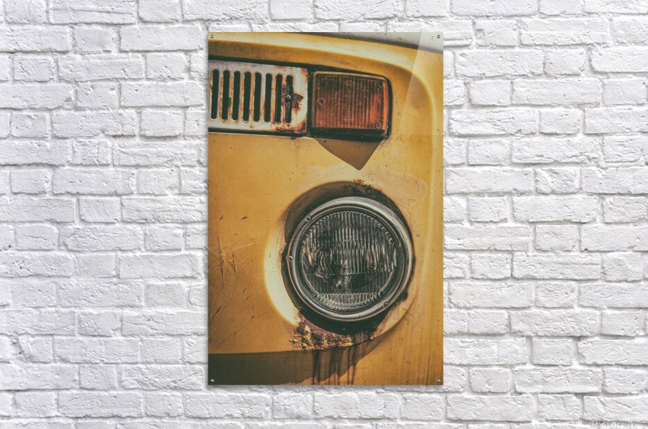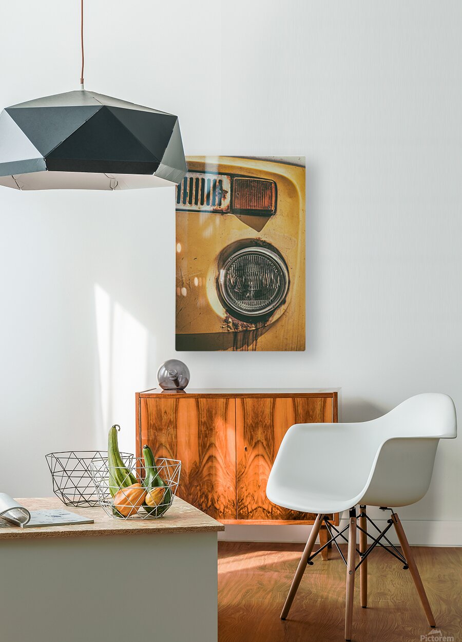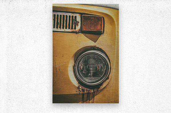 The front section of an abandoned yellow VW T2 campervan its headlight streaked with rust that trails down like tears. Time has worn the metal and dulled the paint leaving behind a face full of quiet expression and forgotten stories. A great photograph for those drawn to character nostalgia and the poetry found in decay.