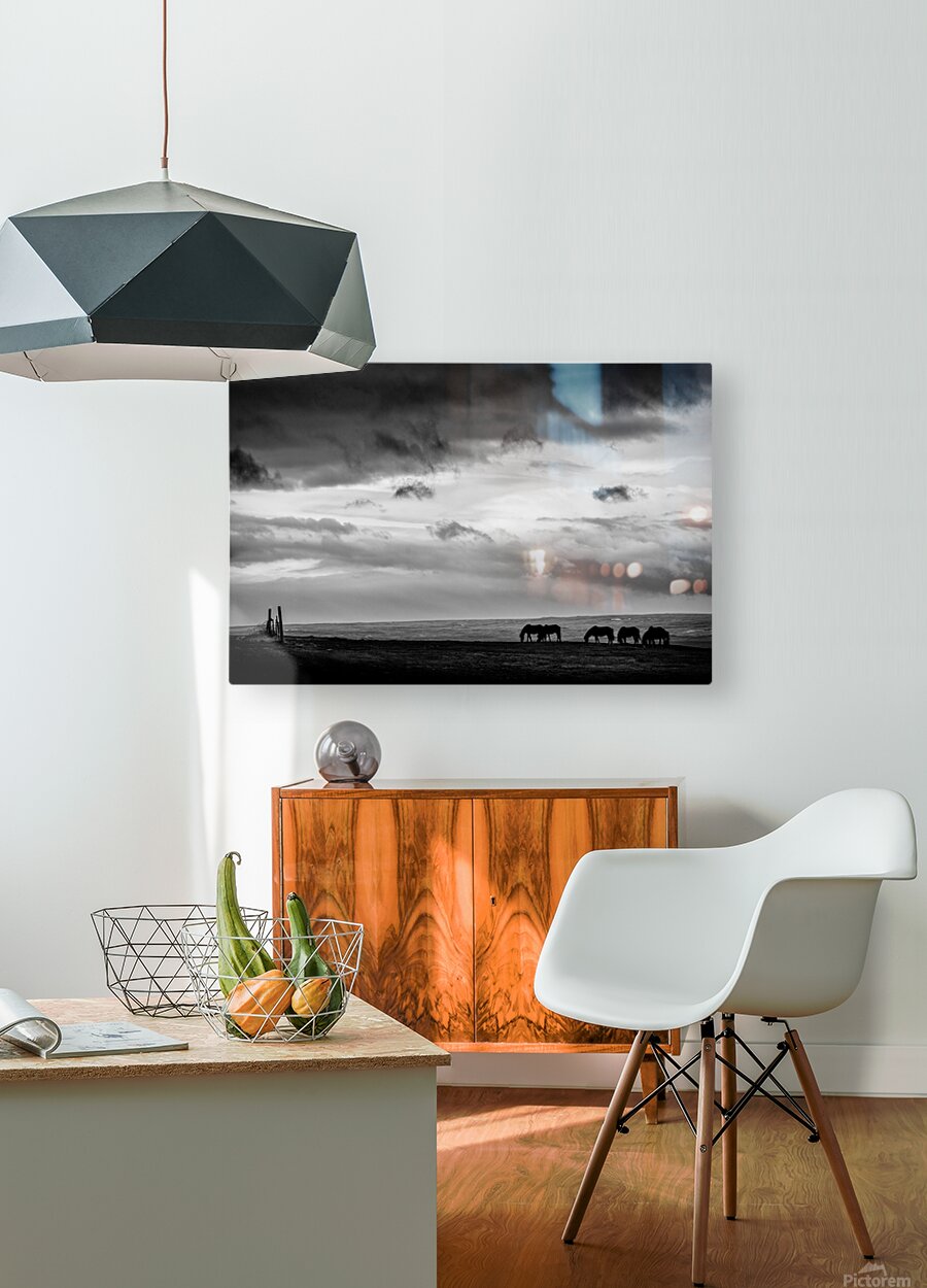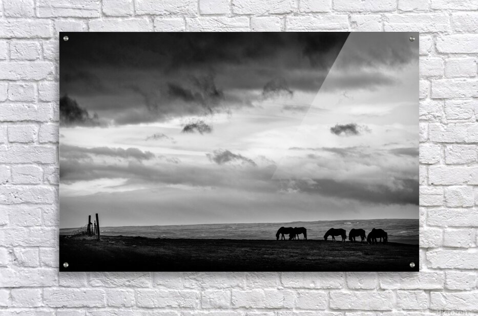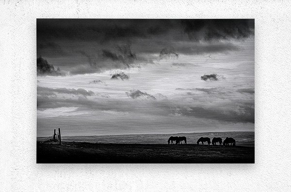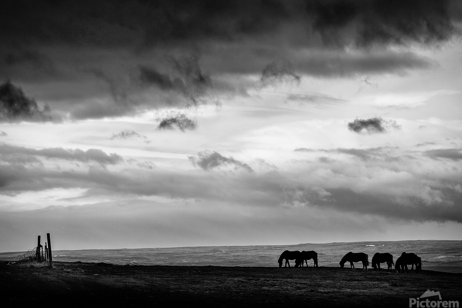 Silhouetted Icelandic horses stand quietly at days end near Hvammstangi their forms small against the vast open landscape. Heavy clouds hang low above adding weight to the scene and a sense of stillness as light fades. A perfect photograph for those drawn to Iceland’s raw beauty and the quiet connection between animal and land.