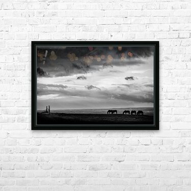 Silhouetted Icelandic horses stand quietly at days end near Hvammstangi their forms small against the vast open landscape. Heavy clouds hang low above...[+]