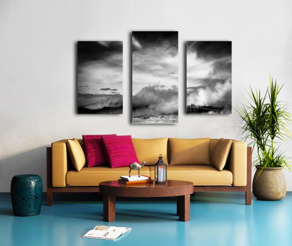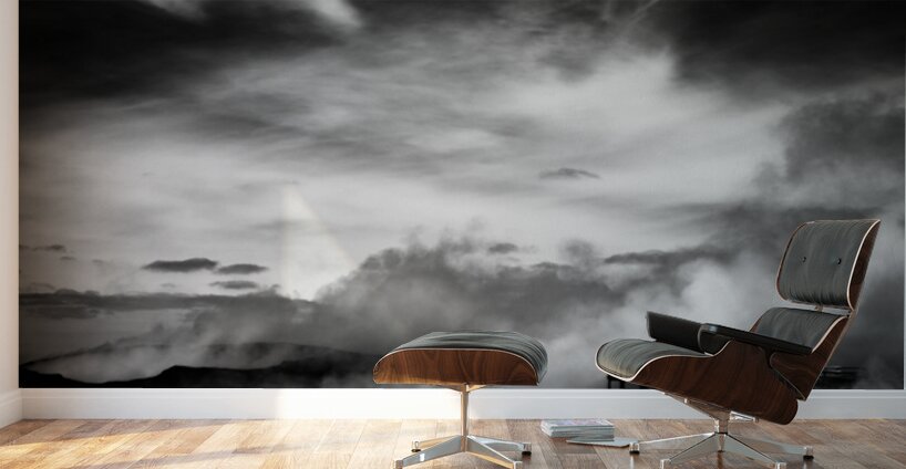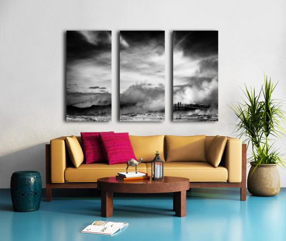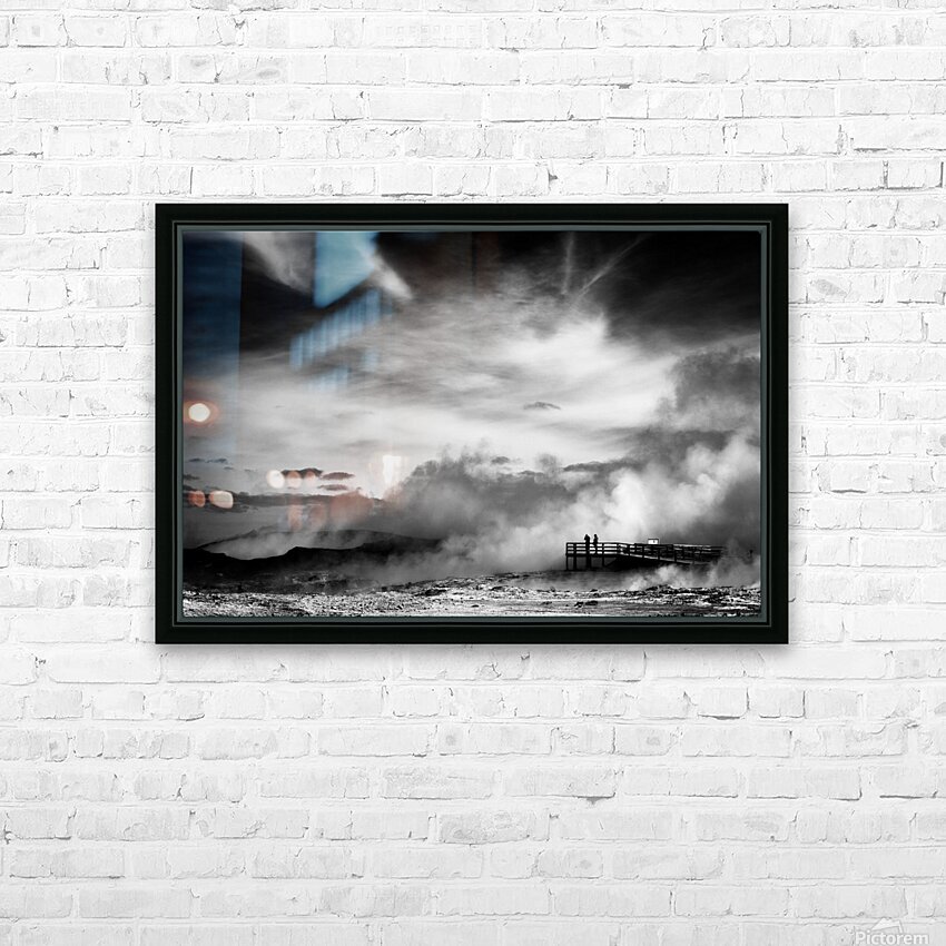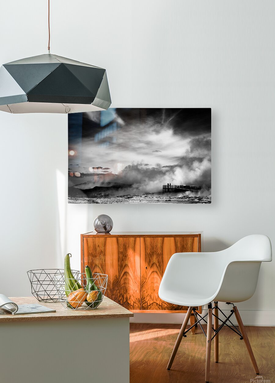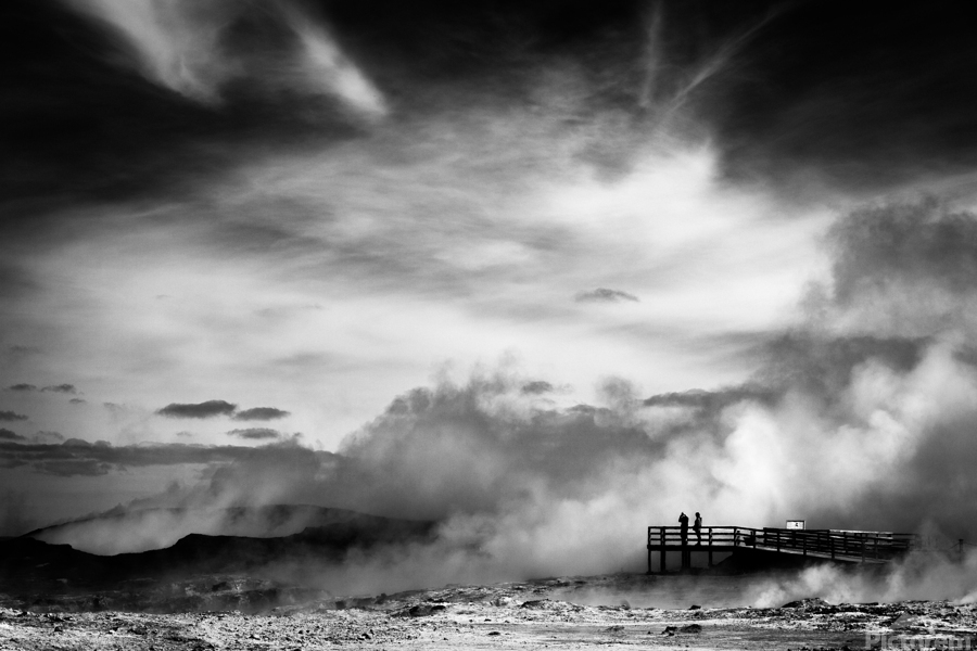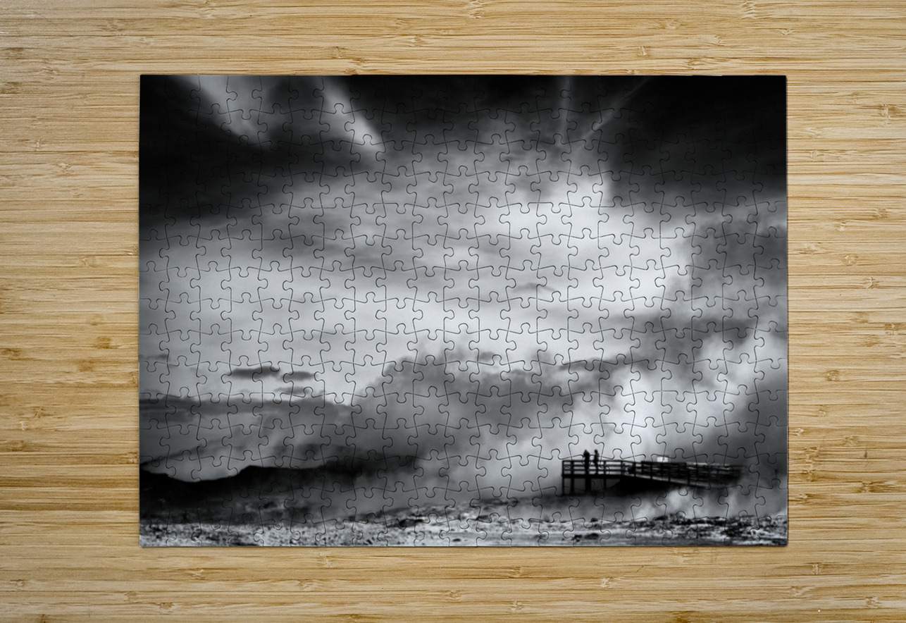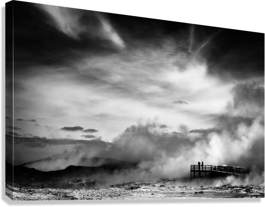 A striking black and white fine art photograph capturing the dramatic volcanic landscape of Reykjanes Iceland. Thick plumes of steam rise from geothermal vents in the barren ground while a distant observation platform holds the silhouetted figures of two people surveying the raw inhospitable terrain. Located on the southwestern tip of Iceland Reykjanes is a geologically active peninsula known for its vast lava fields rugged terrain and powerful geothermal activity. This otherworldly scene reflects the stark beauty of Iceland’s volcanic landscapes. The contrast between the drifting steam and the bleak earth highlights the untamed forces that shape this environment. With little vegetation and an unforgiving atmosphere Reykjanes embodies the wild energy of the land offering a glimpse into the raw power simmering beneath the surface. Ideal for anyone drawn to minimalist landscapes dramatic natural scenes or the stark beauty of volcanic terrain. This artwork complements modern industrial or Scandinavian-style interiors bringing a sense of atmosphere drama and quiet intensity to any space. Available in a range of formats including canvas metal and framed prints.