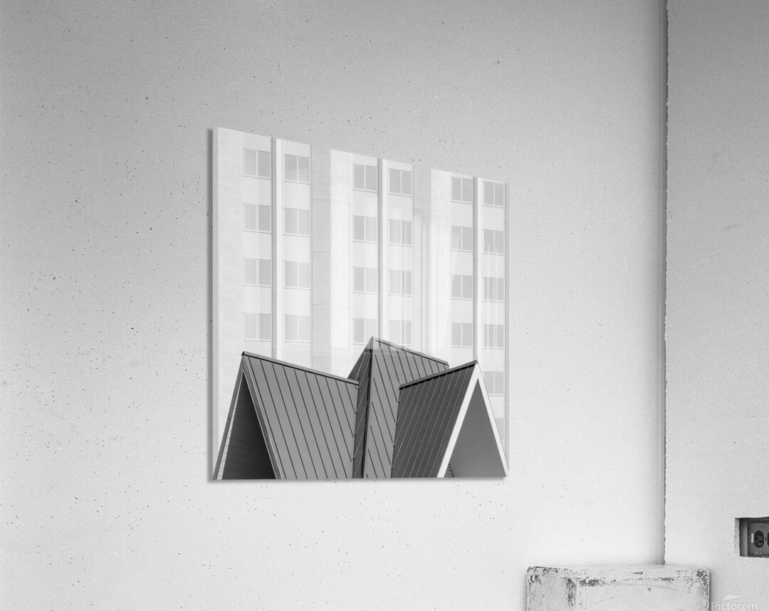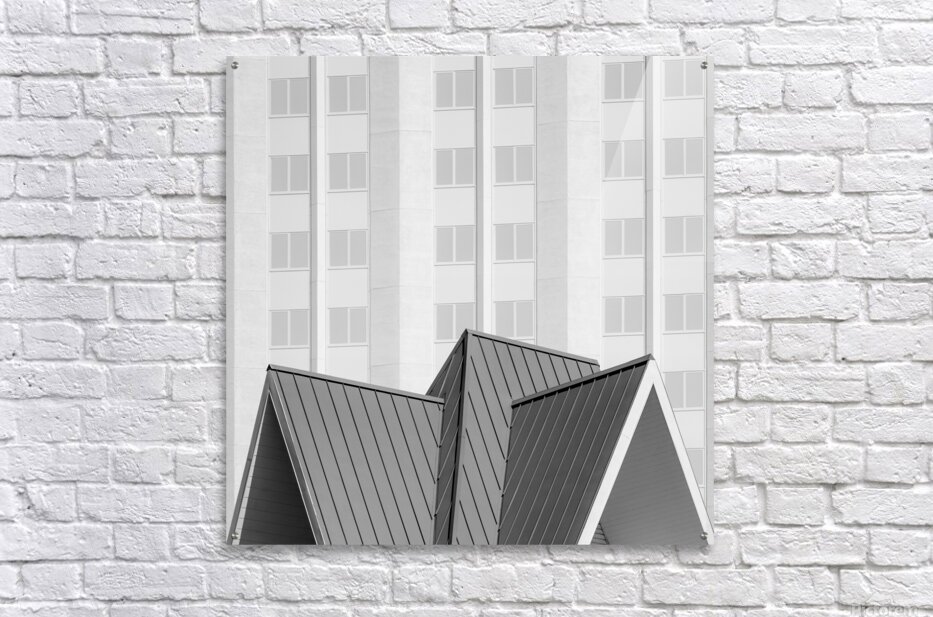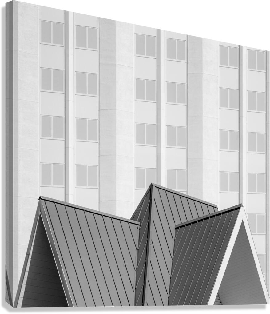 A monochrome fine art print featuring the Tropicana Hotel and Resort in Las Vegas USA. This semi-abstract composition highlights the sharp angular roofline of a resort building set against a grid of hotel windows capturing the geometric contrast and architectural character of this iconic location. Opened in April 1957 the Tropicana was a landmark of mid-century Las Vegas known as the “Tiffany of the Strip.” Famed for its stained-glass canopy Rat Pack performances Siegfried & Roy shows and appearances in Diamonds Are Forever and The Godfather it also carried deep mob-era connections through figures like Frank Costello. Its closure on April 2 2024 followed by demolition marked the end of the last true mob-era structure on the Strip leaving only heavily rebuilt properties like the Flamingo behind. This artwork is ideal for lovers of architectural photography Las Vegas history and minimalist urban design. A striking piece for modern interiors it is available as wall art and in a wide range of other product formats.