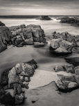 A monochrome photograph capturing a stream flowing between rocks toward the sea on a beach along the west coast of Barra Isle Outer Hebrides Scotland. The long exposure technique smooths the motion of both the sea and the clouds creating a serene and ethereal atmosphere. Barra Isle is part of the Outer Hebrides known for its rugged coastline remote beaches and natural beauty. This image highlights the peaceful interaction between land water and sky in a wild Scottish seascape. Ideal for those seeking calming coastal imagery this photograph suits modern interiors and nature-themed décor. It is available as wall art and a wide range of other product formats.