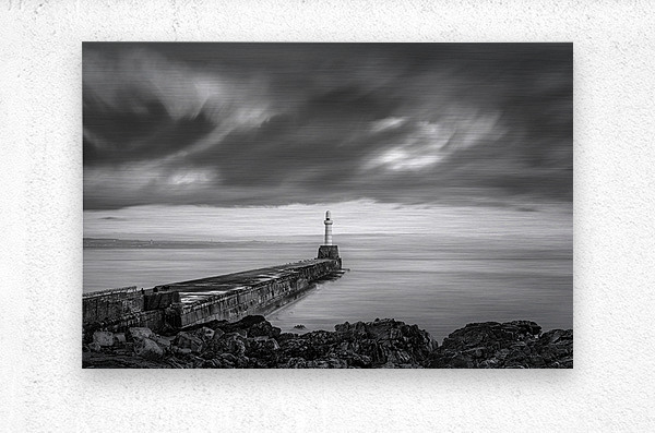A monochrome long-exposure photograph of Aberdeen’s South Pier in Scotland capturing the quiet strength of the stone pier stretching out toward the beacon at its end. The softened water blurred by the long exposure contrasts with the sharp lines of the pier highlighting its enduring presence against the shifting sea. Located in the historic harbour of Aberdeen the South Pier has long served as a vital part of the city’s maritime heritage. Its weathered stonework stands as a testament to generations of seafarers shipbuilders and harbour workers who shaped the identity of this rugged northeast coastline. The image captures not only the physical structure but also the atmosphere of solitude resilience and quiet reflection that defines this coastal landscape. Ideal for those drawn to minimalist seascapes maritime history and contemplative imagery this photograph is available as wall art and a wide range of other product formats.