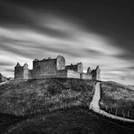 A monochrome long exposure photograph of Ruthven Barracks near Ruthven in Badenoch Scotland. The dramatic scene features the imposing remains of the b...[+]
