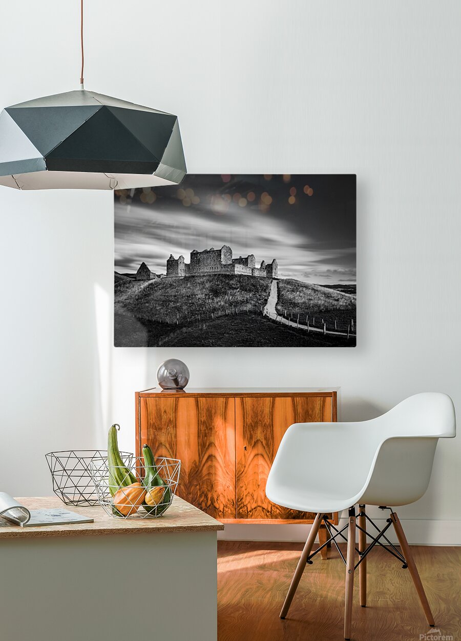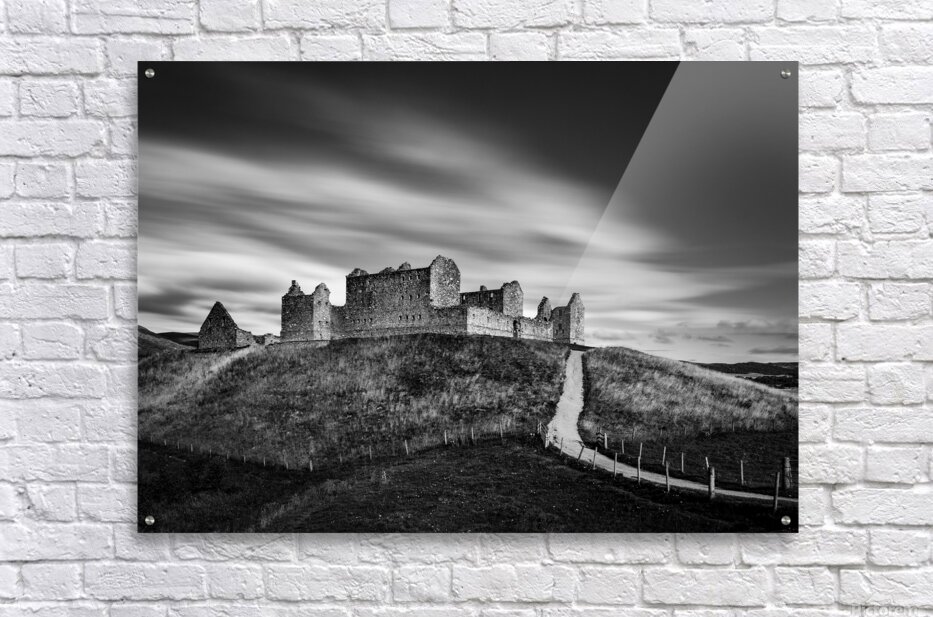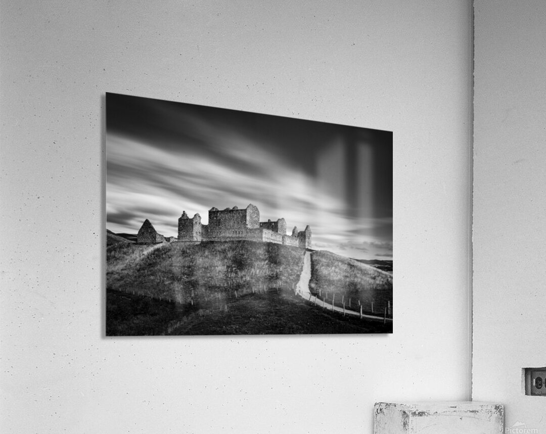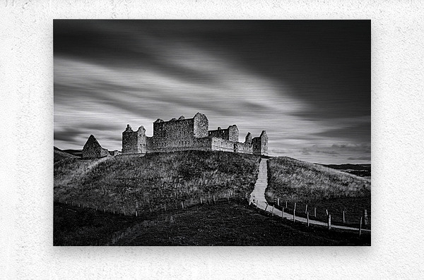 A monochrome long exposure photograph of Ruthven Barracks near Ruthven in Badenoch Scotland. The dramatic scene features the imposing remains of the barracks standing atop their hill with streaking clouds moving overhead creating a sense of motion against the stillness of the landscape. Ruthven Barracks was built in the early 18th century following the Jacobite rising of 1715. Its strategic hilltop location overlooking the River Spey allowed government forces to control movement through the Highlands. Abandoned after the Jacobite defeat in 1746 the barracks remain a powerful symbol of Scotland’s turbulent history with their skeletal stone walls dominating the rural landscape to this day. This photograph is ideal for anyone drawn to atmospheric landscapes Scottish history and minimalism. A striking addition to modern interiors it is available as wall art and a wide range of other product formats.