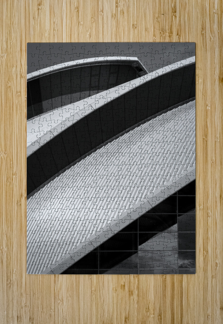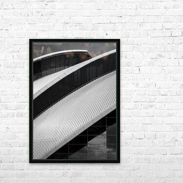 A monochrome photograph of the SEC Armadillo in Glasgow, Scotland. This semi-abstract composition focuses on the distinctive curved roofline of the building, highlighting its layered, overlapping forms against a plain sky. The simple palette and graphic lines emphasise the sculptural qualities of this iconic piece of modern architecture. The SEC Armadillo, officially known as the Clyde Auditorium, is part of the Scottish Event Campus on the banks of the River Clyde. Designed by renowned architects Foster + Partners, the building opened in 1997 and quickly became a Glasgow landmark. Its interlocking, shell-like structure earned it the nickname "the Armadillo," reflecting both its striking appearance and its role as a symbol of the city’s architectural regeneration. This photograph is ideal for lovers of contemporary architecture, graphic design, and minimalist art. A bold statement for modern interiors, it is available as wall art and a wide range of other product formats. Please note: This image has a slightly grainy texture because it was photographed on analog film.