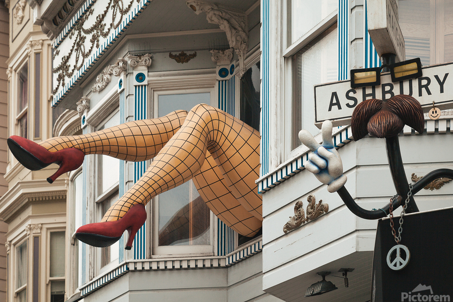 A pair of mannequin legs wearing fishnet stockings and red high heels hang from a window in the Haight-Ashbury neighbourhood of San Francisco California USA. This playful and instantly recognisable landmark juts out from an upper-floor window surrounded by the decorative façades and architectural details typical of this vibrant area. Located in the heart of San Francisco’s historic counterculture district the legs have become a symbol of Haight-Ashbury’s eccentric free-spirited identity. The neighbourhood rose to fame during the 1960s as the epicentre of the Summer of Love attracting artists musicians and bohemian communities. Today it remains a lively hub of alternative culture vintage stores street art and eclectic landmarks. This photograph is ideal for lovers of quirky urban scenes pop culture and travel imagery. A bold and fun addition to any modern interior it is available as wall art and a wide range of other product formats.