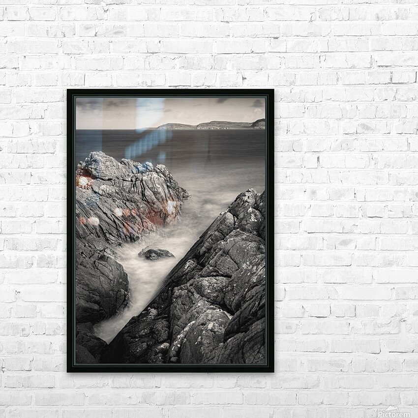 A monochrome photograph of coastal rocks leading into the sea on the west coast of Scotland near Loch Ewe. A long exposure has been used to capture the movement of water flowing between the rocks softening the surface of the sea and creating a sense of calm and motion within the rugged landscape. This scene is located at Cove on the shores of Loch Ewe a remote and atmospheric part of the Scottish Highlands. The area is known for its striking coastal scenery with rocky shorelines open seascapes and expansive views across the water. Cove also holds historical significance with remnants of World War II fortifications overlooking the loch once an important naval anchorage. Ideal for anyone drawn to minimalist coastal landscapes Scottish scenery and monochrome photography. A calming and contemplative piece for modern interiors it is available as wall art and a wide range of other product formats.