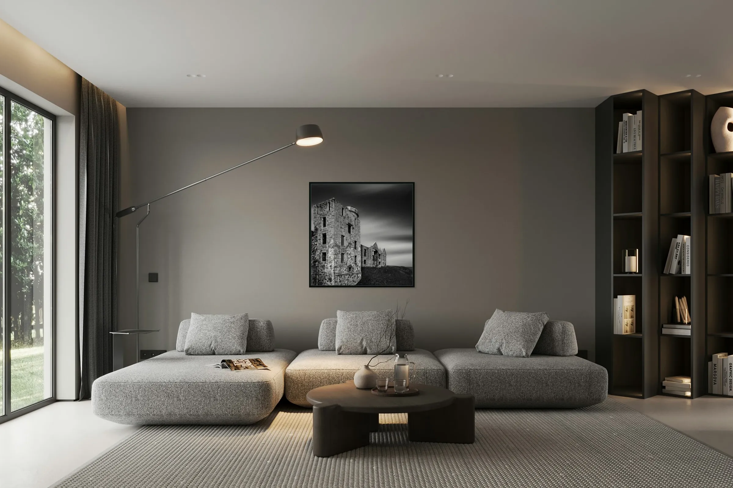 A monochrome photograph of Slains Castle on the northeast coast of Aberdeenshire Scotland. The image captures the sea-facing side of the castle its weathered stone walls standing stark against a sky filled with fast-moving dramatic clouds. The dark brooding atmosphere enhances the sense of isolation and ruggedness that defines this ruined clifftop fortress. Perched above the North Sea near Cruden Bay in Aberdeenshire Slains Castle has a long and storied history dating back to the 16th century. Once the home of the Earls of Erroll it has been associated with tales of intrigue shipwrecks and legends. Its striking windswept location is widely believed to have inspired Bram Stoker during his writing of Dracula following his visit to the area in the late 19th century. This photograph is ideal for those drawn to dramatic landscapes historic architecture and moody atmospheric imagery. It is available as wall art and a wide range of other product formats.