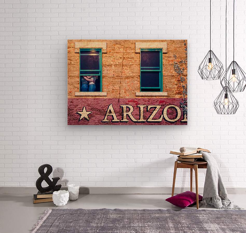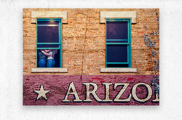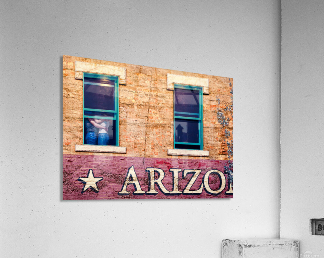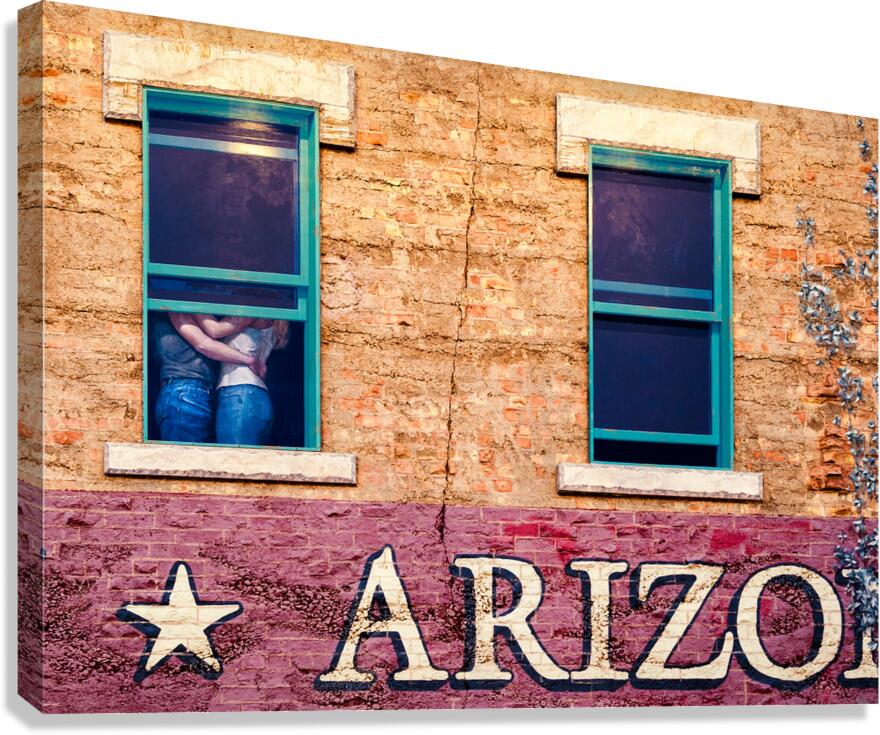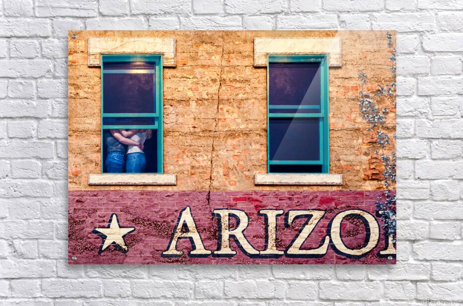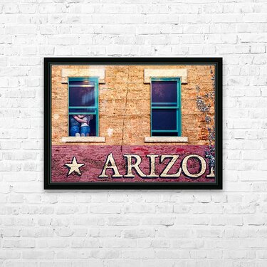 An image of the iconic corner in Winslow Arizona USA made famous by the Eagles song Take It Easy. Visible are the decorative windows and faded wall art that mark this legendary location including the mural of a couple embracing in an upstairs window and partial painted lettering reading “Arizona” below. Subtle weathering and muted tones give the scene a nostalgic small-town charm. Immortalised in the lyrics “standing on a corner in Winslow Arizona” this spot has become a pilgrimage site for music fans and travellers alike. The mural part of a larger public art installation pays tribute to the song’s enduring cultural legacy and the spirit of classic Americana. Winslow itself was once a key stop along historic Route 66 and this corner preserves a piece of that heritage. This photograph is ideal for fans of music history Americana and vintage roadside culture. A unique addition to any home or studio space it is available as wall art and a wide range of other product formats.