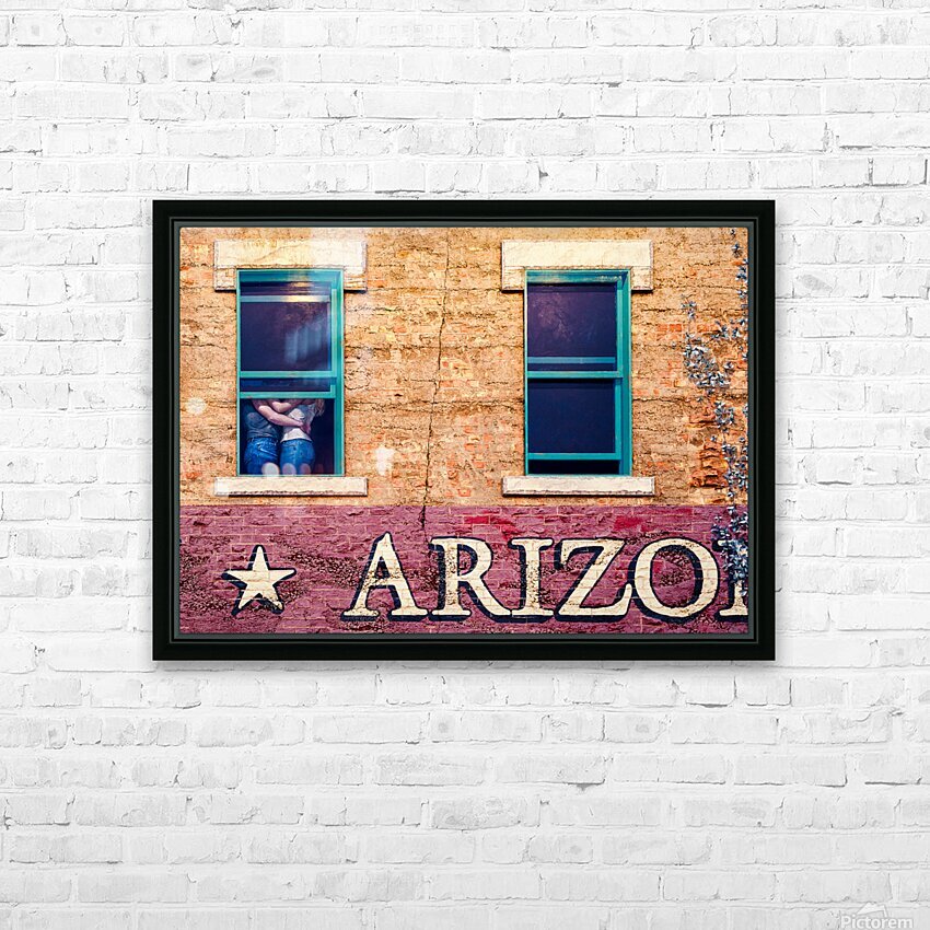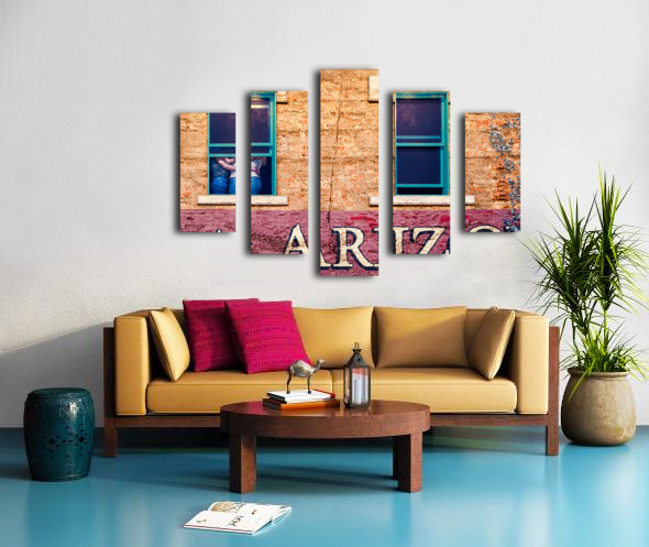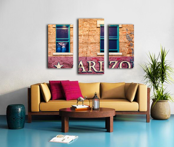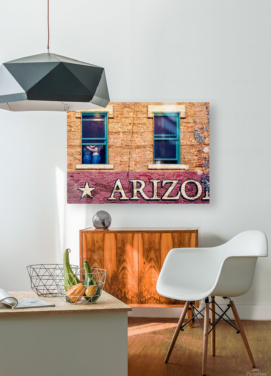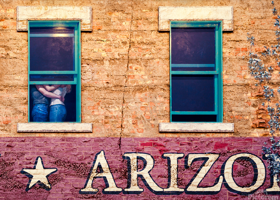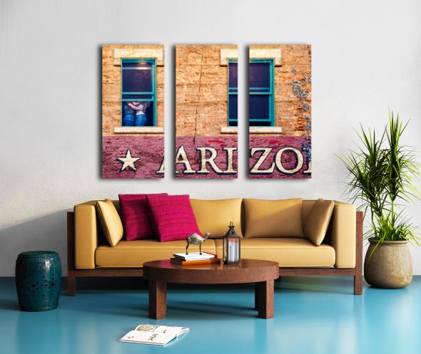 An image of the iconic corner in Winslow Arizona USA made famous by the Eagles song Take It Easy. Visible are the decorative windows and faded wall art that mark this legendary location including the mural of a couple embracing in an upstairs window and partial painted lettering reading “Arizona” below. Subtle weathering and muted tones give the scene a nostalgic small-town charm. Immortalised in the lyrics “standing on a corner in Winslow Arizona” this spot has become a pilgrimage site for music fans and travellers alike. The mural part of a larger public art installation pays tribute to the song’s enduring cultural legacy and the spirit of classic Americana. Winslow itself was once a key stop along historic Route 66 and this corner preserves a piece of that heritage. This photograph is ideal for fans of music history Americana and vintage roadside culture. A unique addition to any home or studio space it is available as wall art and a wide range of other product formats.