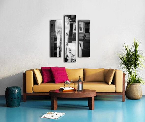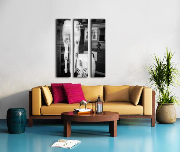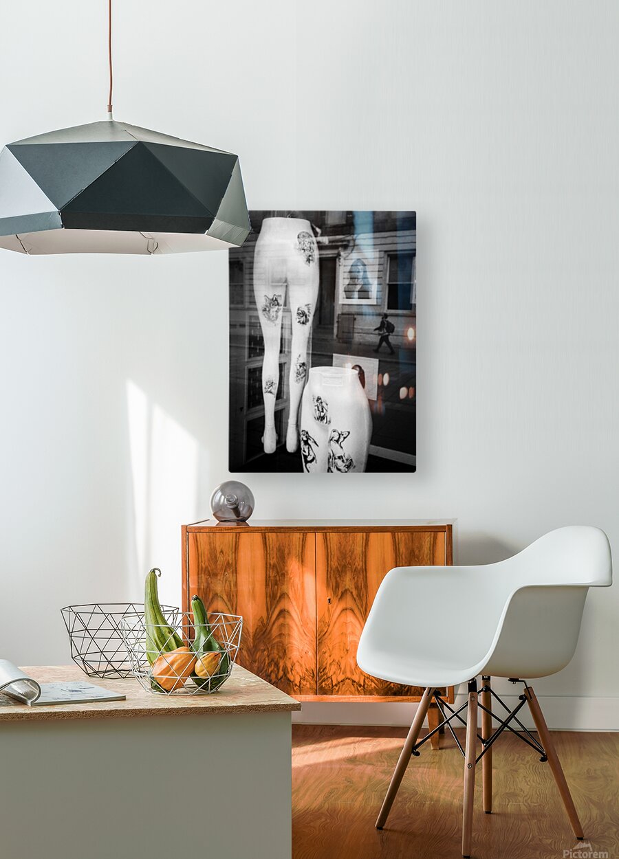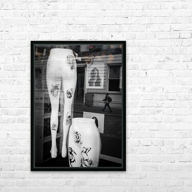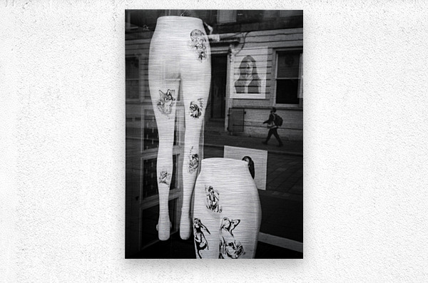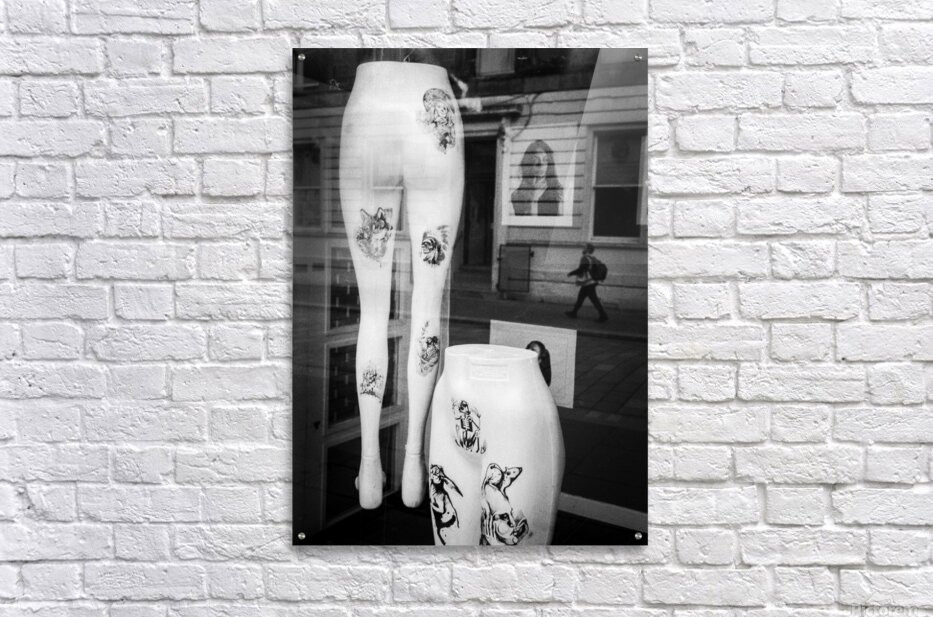 Two pairs of white mannequin legs are positioned in a store window display in Glasgow each marked with bold black and white artwork resembling tattoos. Reflected in the glass is a passer-by walking along the street adding a fleeting human presence to the otherwise static stylised scene. The contrast between the stark mannequins and the street reflection creates a layered urban composition. Set in the heart of Glasgow this image captures a brief moment of overlap between shopfront artifice and city life. The tattoo-like designs on the mannequins add an edgy almost subcultural element to the display while the reflection hints at the rhythm and anonymity of daily movement in the city. This photograph is ideal for lovers of urban photography street reflections and visual contrasts. A distinctive and contemporary piece it is available as wall art and a wide range of other product formats.