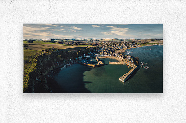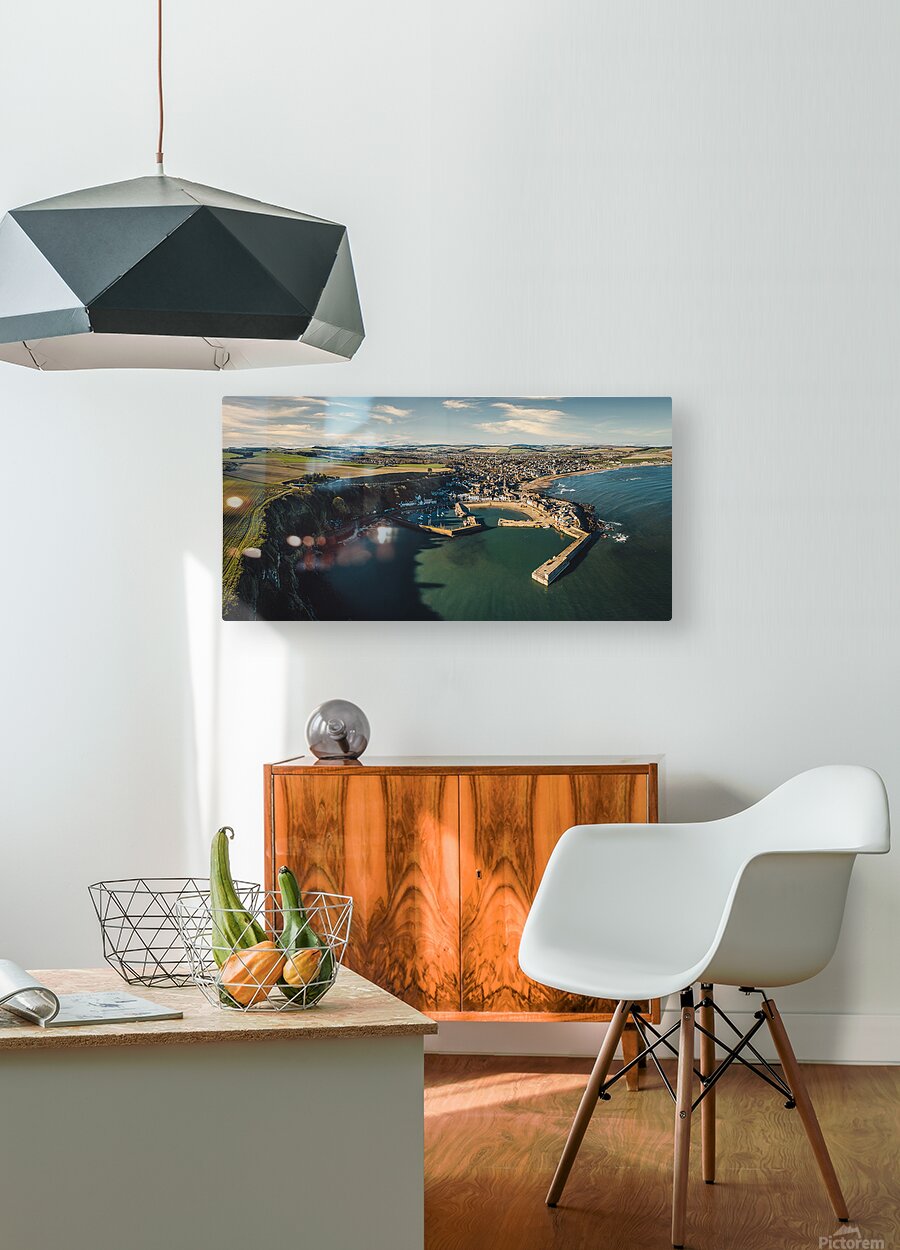 An aerial panoramic view of Stonehaven on Scotland’s Aberdeenshire coast with the town basking in sunshine beneath a sky scattered with light cloud. The scene captures the rugged cliff edge and protective harbour wall in the foreground with the seafront and town buildings stretching out beyond. Stonehaven is a historic fishing town nestled between steep cliffs and the North Sea known for its scenic harbour friendly community and proximity to the dramatic ruins of Dunnottar Castle. The town’s waterfront blends traditional stone buildings with colourful houses and boats creating a picturesque and welcoming coastal atmosphere. Ideal for anyone with a connection to northeast Scotland coastal landscapes or Scottish travel memories this image is available as wall art and in a wide range of other formats.