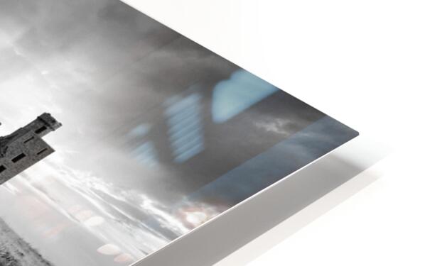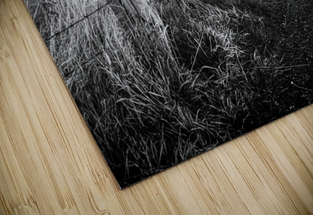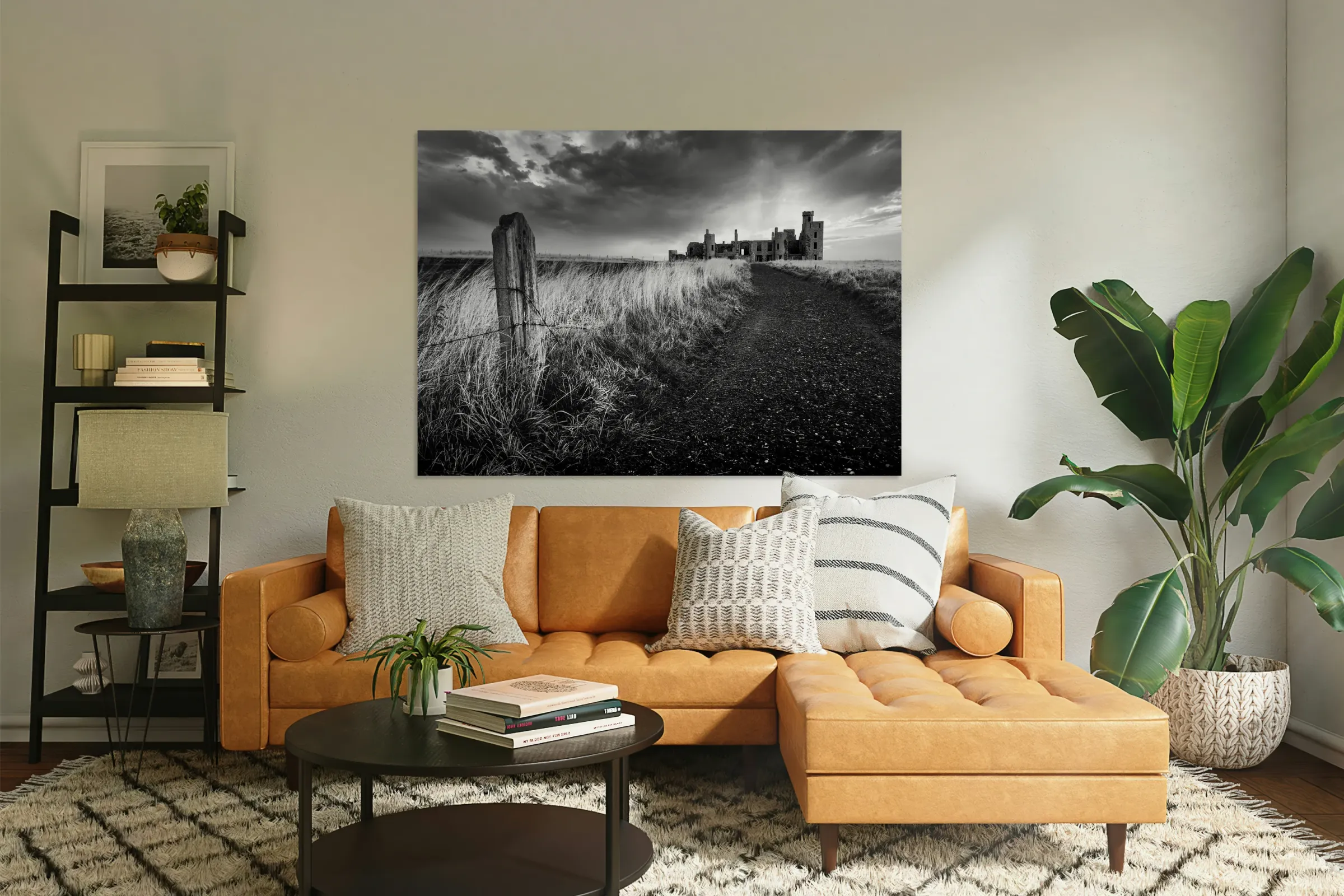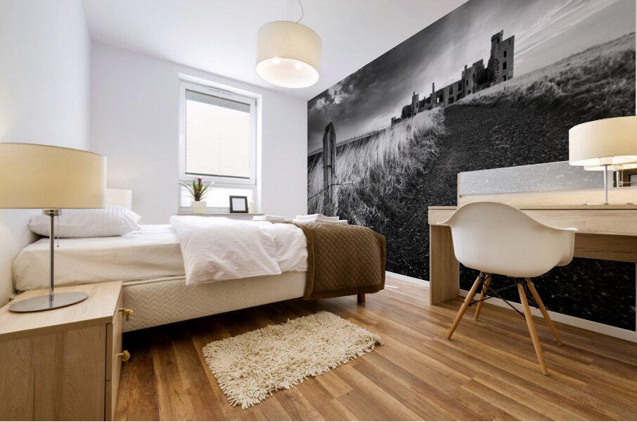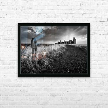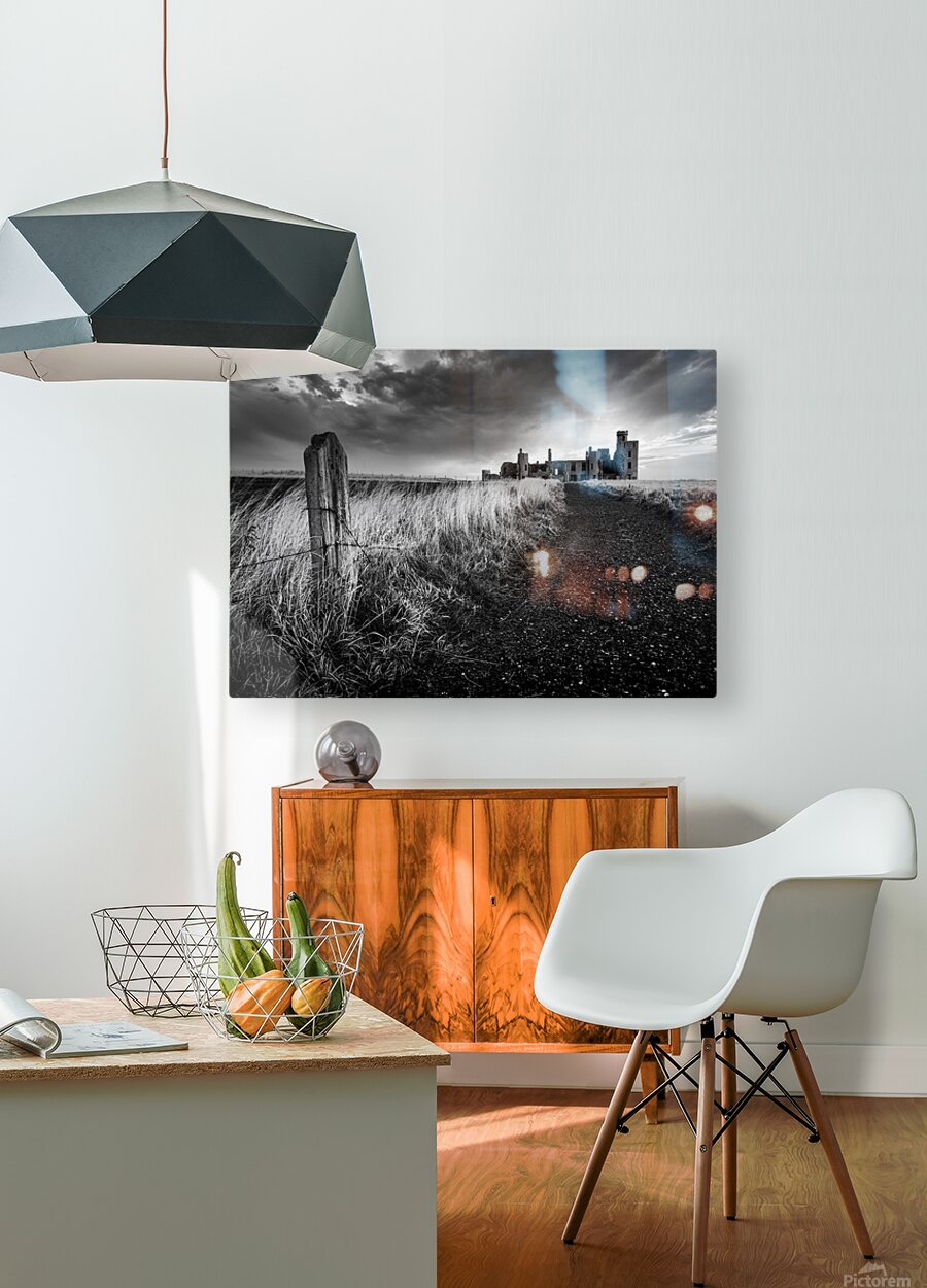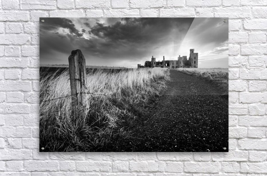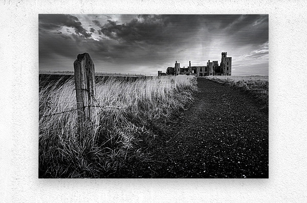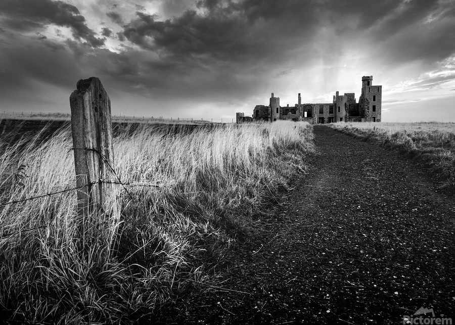 Slains Castle stands against a backdrop of heavy cloud with low sunlight breaking through behind its silhouette. A slight curve in the coastal path leads toward the ruins flanked by long grass and an old weathered fence post in the foreground. The dramatic lighting and darkened sky lend a stark atmospheric quality to the scene. Located in Aberdeenshire on Scotland’s northeast coast Slains Castle overlooks the North Sea from a high cliff edge. Its remote setting and imposing structure have made it a striking presence on the landscape and it is widely believed to have inspired Bram Stoker while writing Dracula. This monochrome photograph is available as wall art and in a variety of print-on-demand formats suitable for home office or travel-themed decor.