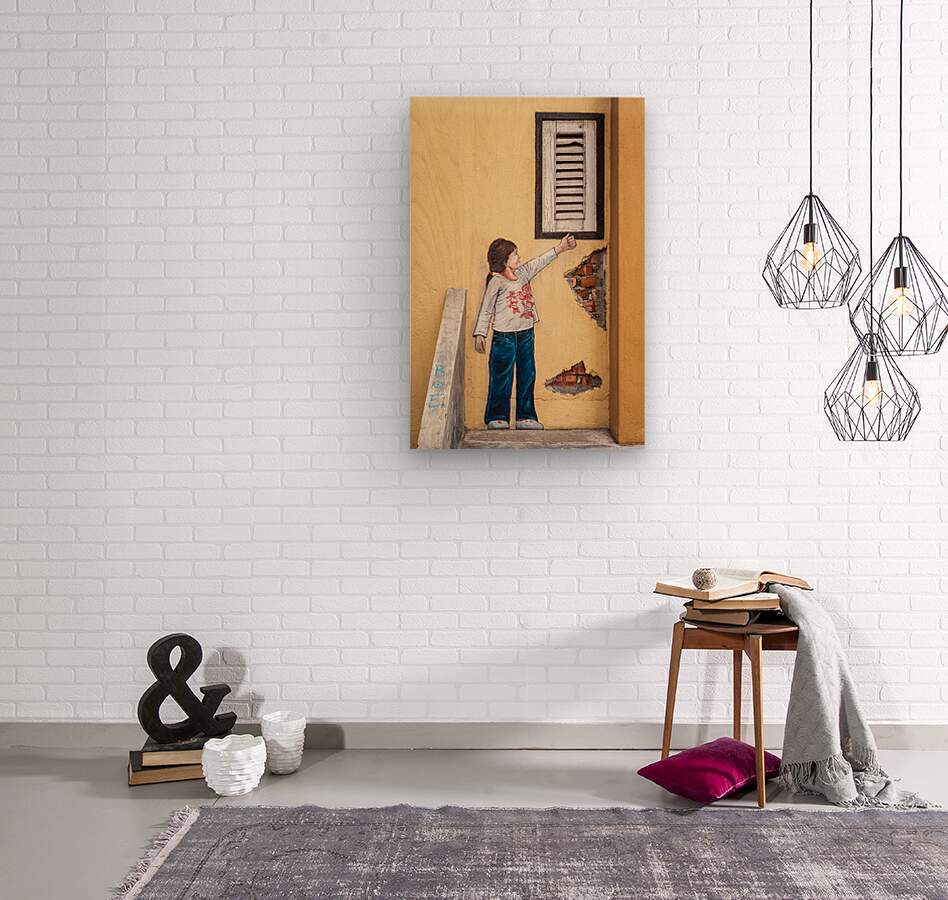 A girl is depicted reaching upwards toward a real shuttered window in this striking mural found in the backstreets of Ipoh Malaysia. Painted directly onto a faded yellow wall where areas of plaster have crumbled to expose red brick beneath the artwork blends two and three-dimensional elements to playful effect. Located in Ipohs old town the mural is part of the citys growing collection of street art which has helped revitalise its alleyways and historic buildings. Once a major hub for the tin mining industry Ipoh is now known for its vibrant culture colonial architecture and thriving food scene. Works like this one form a visual link between the citys past and its creative present. Ideal for anyone drawn to urban art travel culture and Southeast Asian cityscapes this image is available as wall decor and in a variety of other print-on-demand formats.