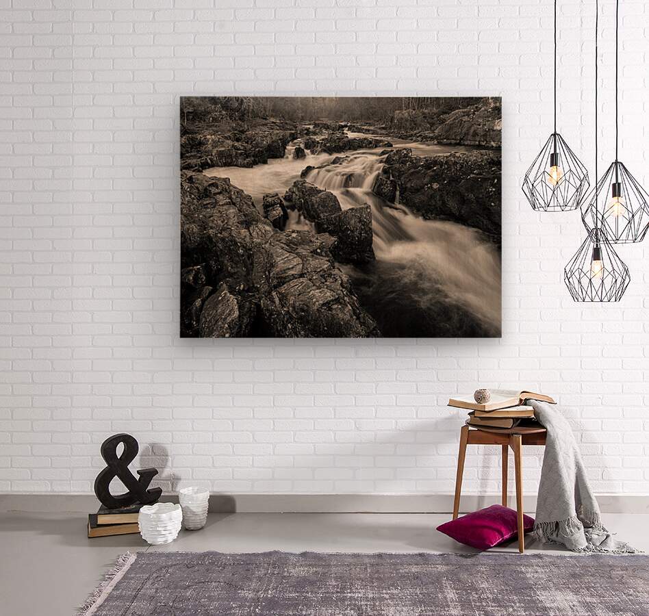 White water rapids surge through a rocky stretch of the River Tummel near Pitlochry in Perthshire Scotland. Captured on an autumn day the image focuses on the restless motion of the river as it crashes over uneven rock filling the frame with texture and force. This part of Highland Perthshire is known for its powerful rivers and dramatic natural beauty especially in the cooler months when the flow intensifies and the air turns crisp. The absence of sky or horizon draws attention to the water’s chaotic rhythm and surface detail. This monochrome photograph is available as wall art and across a wide range of print-on-demand products from home and office decor to personal accessories.