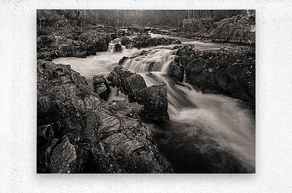 White water rapids surge through a rocky stretch of the River Tummel near Pitlochry in Perthshire Scotland. Captured on an autumn day the image focuses on the restless motion of the river as it crashes over uneven rock filling the frame with texture and force. This part of Highland Perthshire is known for its powerful rivers and dramatic natural beauty especially in the cooler months when the flow intensifies and the air turns crisp. The absence of sky or horizon draws attention to the water’s chaotic rhythm and surface detail. This monochrome photograph is available as wall art and across a wide range of print-on-demand products from home and office decor to personal accessories.