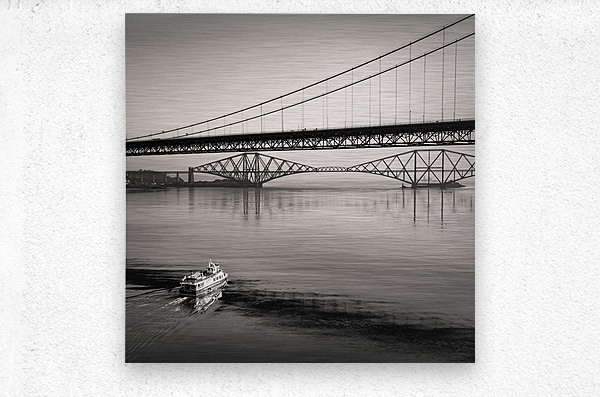 A ferry boat travels along the Forth River at Queensferry Scotland moving steadily toward the iconic silhouettes of the Forth Road Bridge and the Forth Rail Bridge. The vast expanse of water and the imposing industrial forms of the bridges create a sense of scale and quiet drama. This scene captures a moment of everyday life on the Firth of Forth with the boat framed against two of Scotland’s most recognisable engineering landmarks. The Forth Rail Bridge a UNESCO World Heritage Site is celebrated for its distinctive cantilever design while the Road Bridge symbolises the post-war boom in infrastructure. Queensferry nestled between Edinburgh and Fife offers some of the best vantage points for viewing these historic structures. Suitable for anyone with a love of Scottish landscapes industrial heritage or maritime scenes this monochrome photograph is available as wall art and in a variety of other product formats.