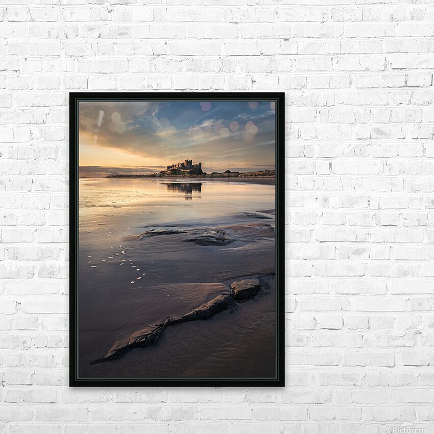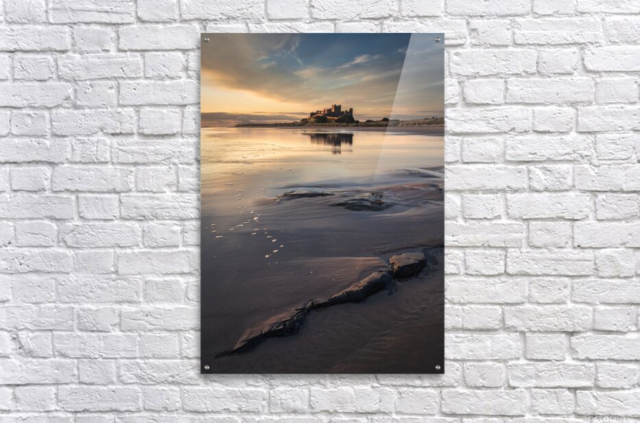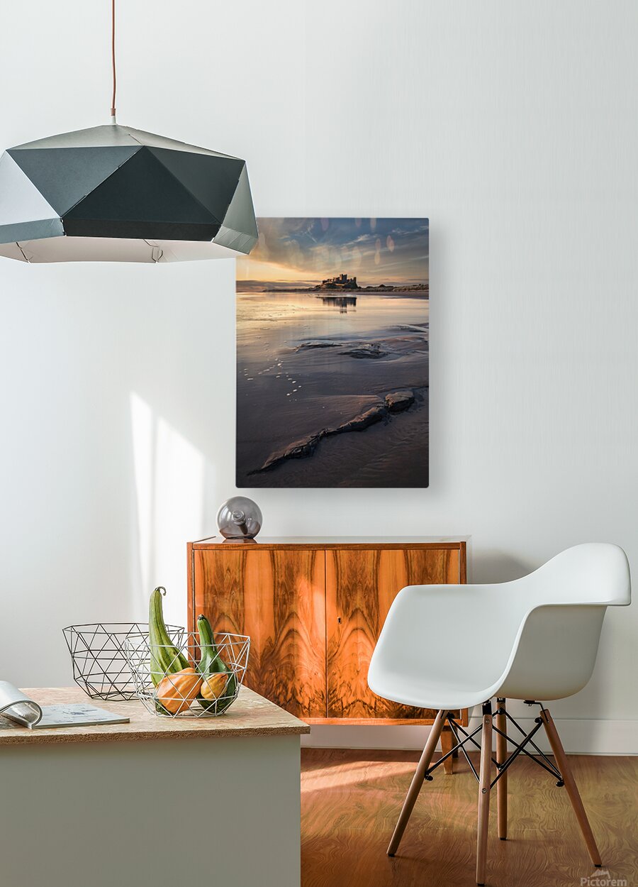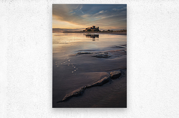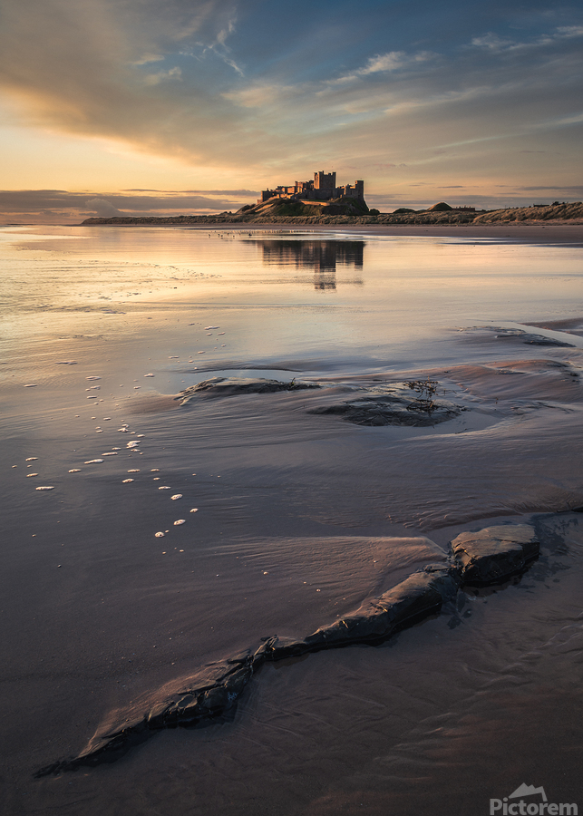 Bamburgh Castle stands illuminated in the soft light of dawn on the Northumberland coast its silhouette reflected in the wet sand and shallow pools left behind by the retreating tide. Sporadic rocks dot the foreground beach while overhead a pale blue sky is streaked with delicate wispy clouds. Once the seat of Northumbrian kings Bamburgh Castle dominates this stretch of England’s northeast coast. Perched on a rocky outcrop overlooking the North Sea it has watched over centuries of history from Anglo-Saxon rule to Norman conquest. The surrounding landscape — wide beaches tidal reflections and open skies adds to the castle’s enduring sense of drama and isolation. Ideal for lovers of historic landmarks seascapes and the coastal beauty of northern England. Available as wall art and across a variety of print-on-demand formats.