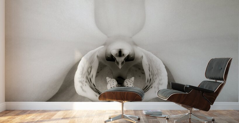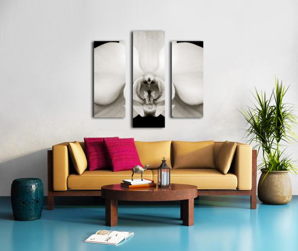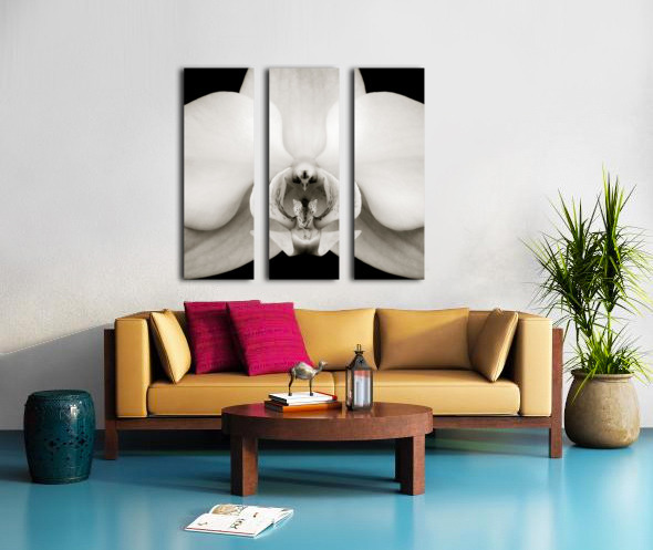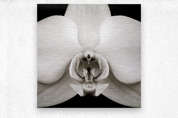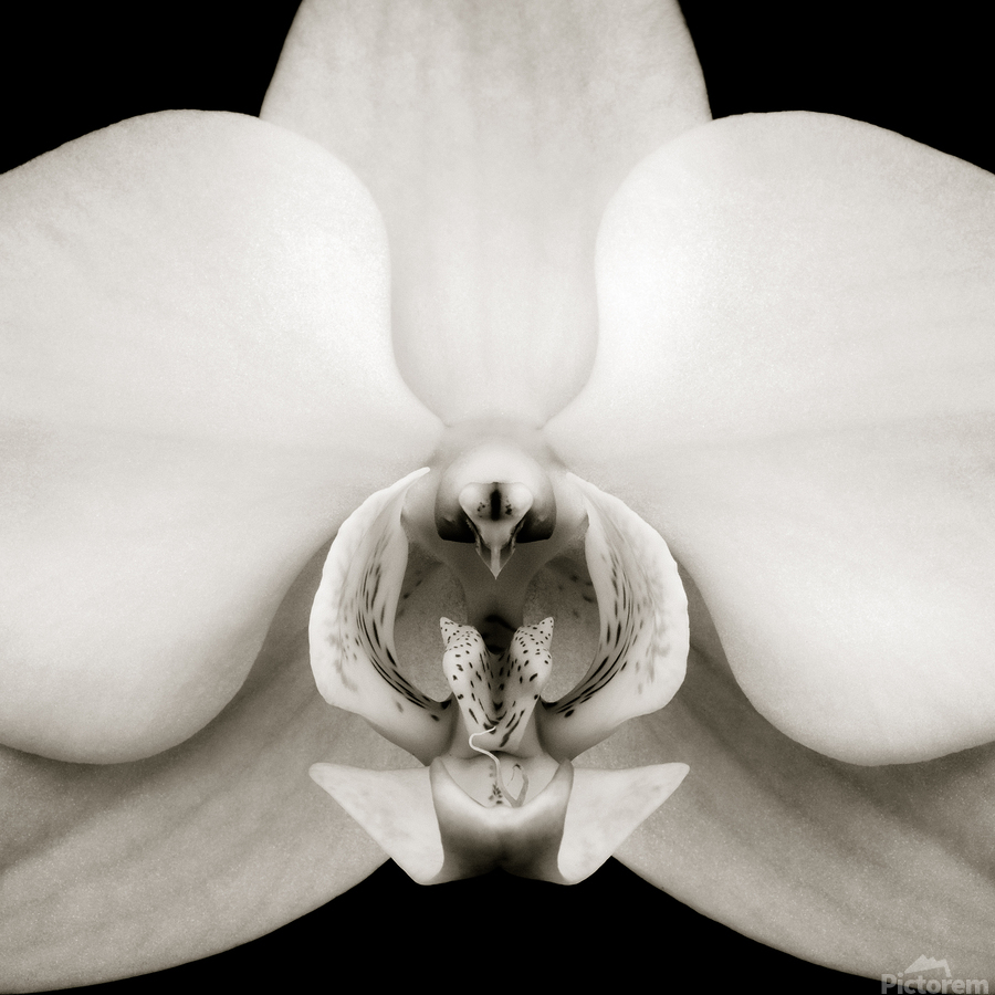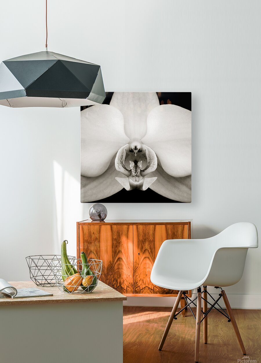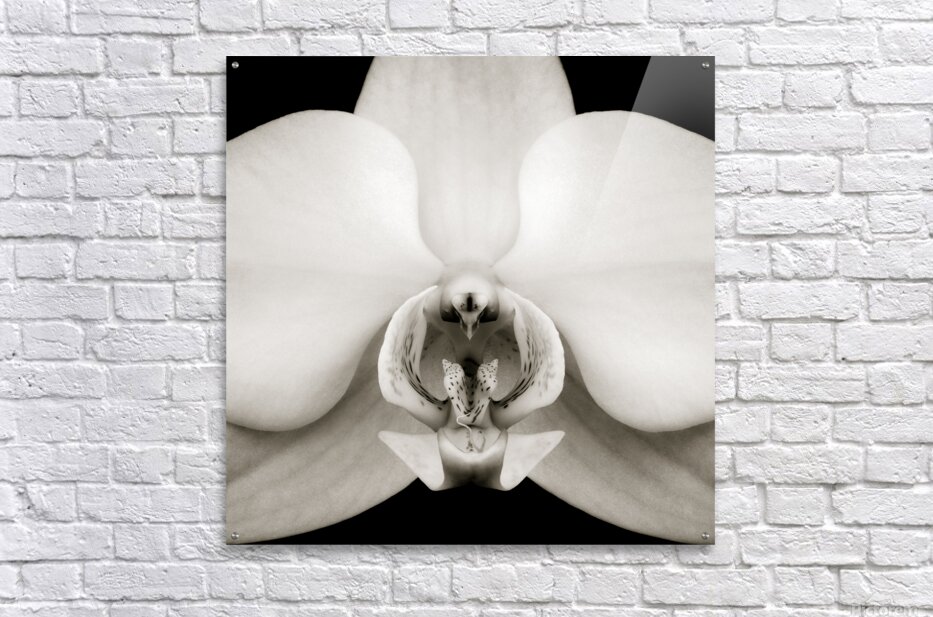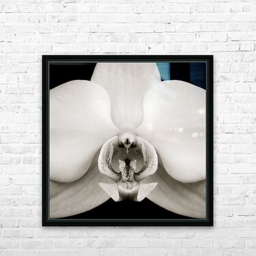 A white orchid in full bloom shown head-on against a black background. The image captures the flower’s symmetrical form in fine detail with broad smooth petals extending outward and a densely structured centre drawing the eye inward. The monochrome treatment enhances the sculptural quality of the bloom highlighting contrast and texture without the distraction of colour. Orchids have long been symbols of elegance and resilience thriving in environments from tropical forests to domestic greenhouses. This particular image isolates the bloom from its surroundings allowing the natural architecture of the flower to take full focus both delicate and precise in its construction. Available as wall art and across a wide range of other formats to suit your space or style. ..... Please Note: This image is intentionally presented with a grainy texture as part of its aesthetic.