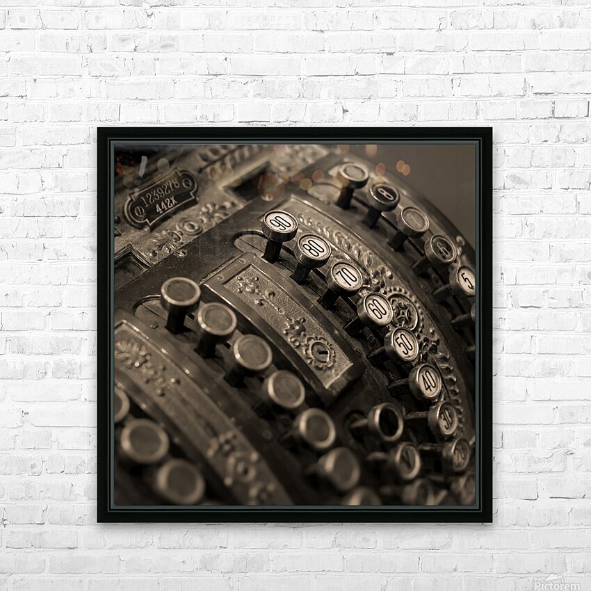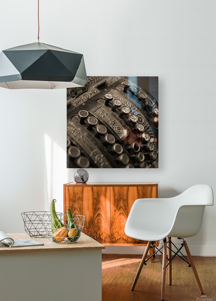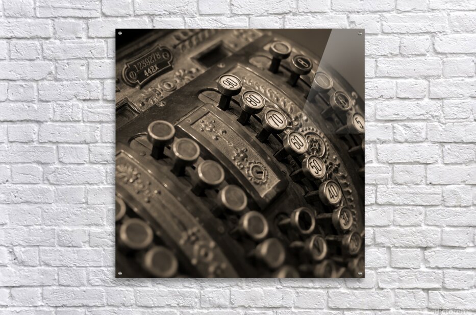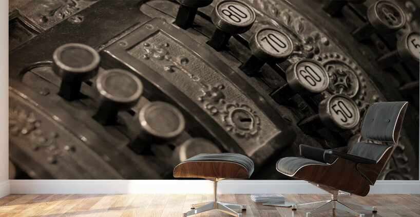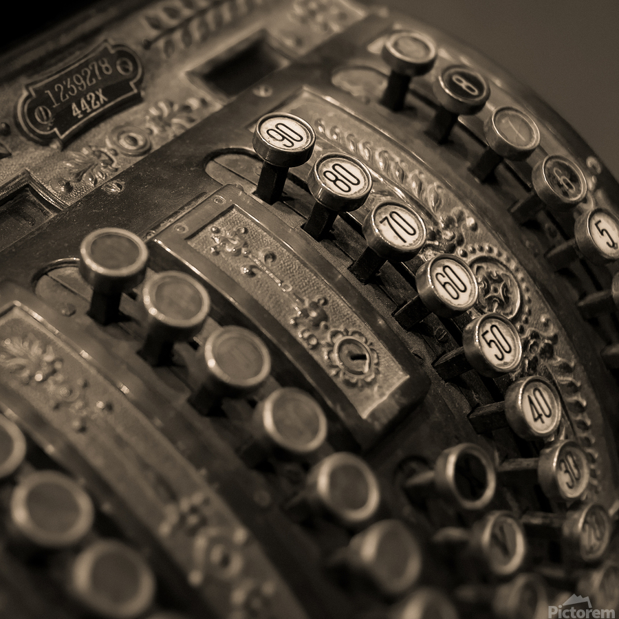 An ornate vintage till is shown in close-up its curved brass surface richly decorated with engraved floral patterns and rows of circular metal keys. Each numbered key stands proud against the aged casing with the labels worn smooth by years of use. The focus draws the eye toward the arc of high-denomination buttons while the surrounding detail fades gently into the background. These antique tills often made by companies like National Cash Register in the late 19th and early 20th centuries were not only functional but also works of craftsmanship. Their solid brass construction intricate scrollwork and mechanical complexity speak to a time when everyday tools were built with permanence and pride. The sepia tones in this image further enhance the sense of age and character evoking the atmosphere of an old-world shop counter. This image offers a tactile glimpse into commercial history perfect for adding a sense of nostalgia and depth to home office or retail spaces. It’s available in a variety of print sizes and finishes to suit both vintage and industrial-style interiors.