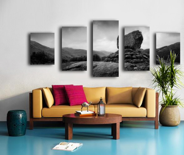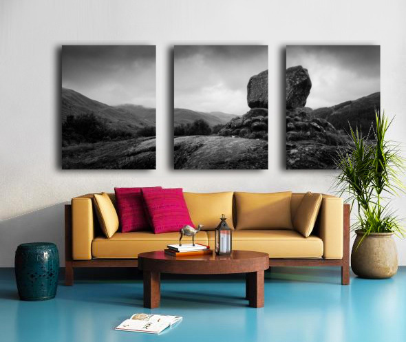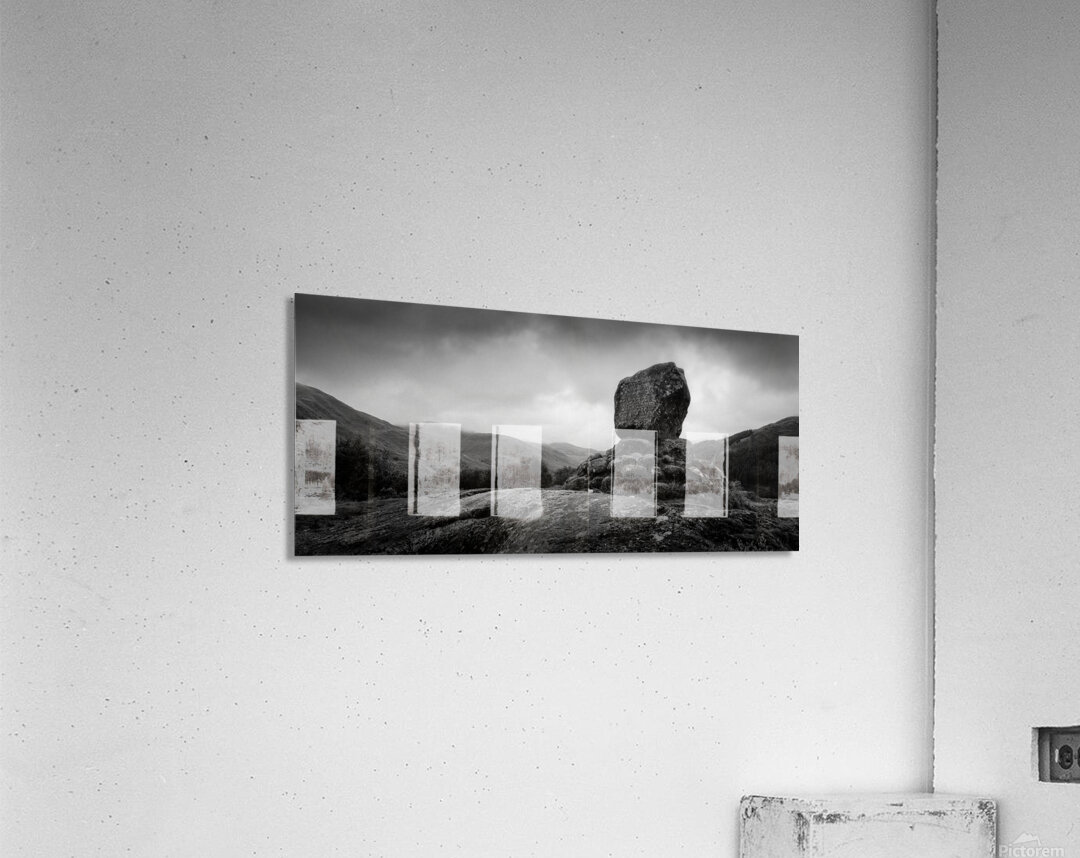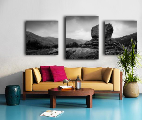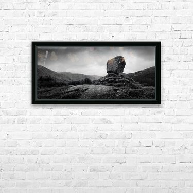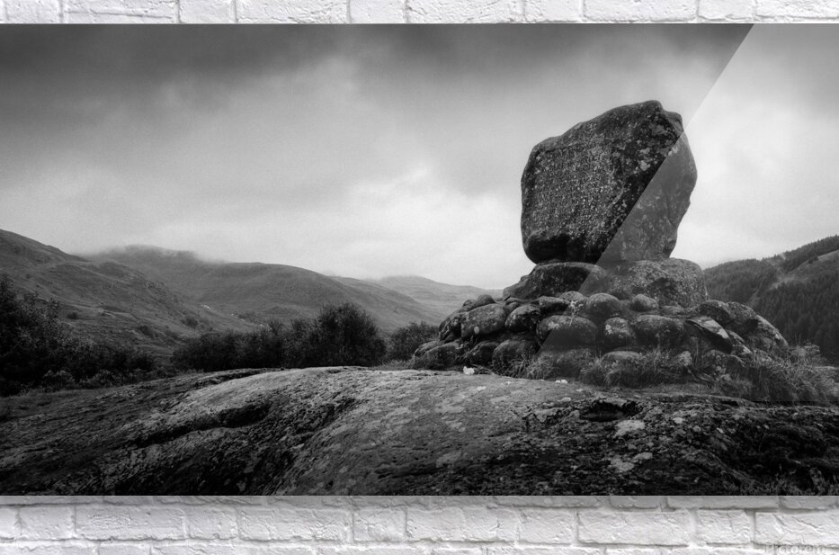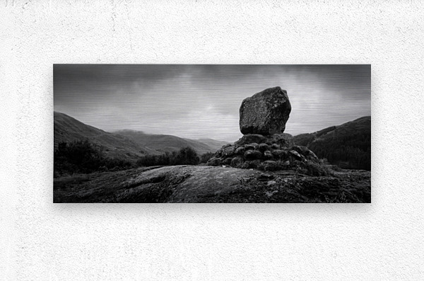 A sweeping monochrome panorama of Bruce’s Stone set high above the still waters of Loch Trool in Dumfries and Galloway Scotland. Captured on analog film the image carries a timeless grain-textured quality with the brooding presence of heavy clouds pressing low over the hills. The wide frame draws the eye across the rugged terrain from the weathered monument in the foreground to the distant ridgelines fading into mist. Bruce’s Stone commemorates King Robert the Bruce’s victory at the Battle of Glen Trool in 1307 a defining moment in Scotland’s fight for independence. The stark black and white tones strip the scene to its essentials of rock water and sky echoing the grit and endurance of both the land and the history it holds. The absence of colour allows the textures of the stone the ripples on the loch and the shifting clouds to take on a quiet drama of their own. Perfect for those drawn to Scottish history wild landscapes or the evocative depth of monochrome photography this piece works beautifully as wall art in spaces seeking a contemplative or heritage-inspired atmosphere.