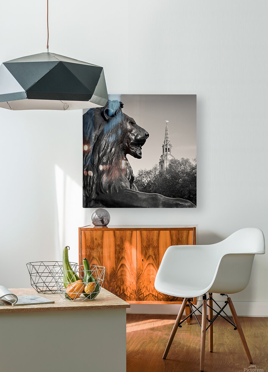 One of the iconic Trafalgar Square lions rests firmly on its stone plinth with St Martin-in-the-Fields Church rising clearly behind it. The clear sky and monochrome tones highlight the textures of the lion’s carved details and the church’s classic architecture creating a striking London scene. Trafalgar Square is at the heart of the city’s history and culture with the church standing as a familiar landmark nearby. Together they capture a moment of quiet strength and timeless design in central London. This image is available as wall art and across a wide range of formats to suit your space or style. It’s perfect for anyone who loves classic London views and monochrome photography that brings out the character of the city.