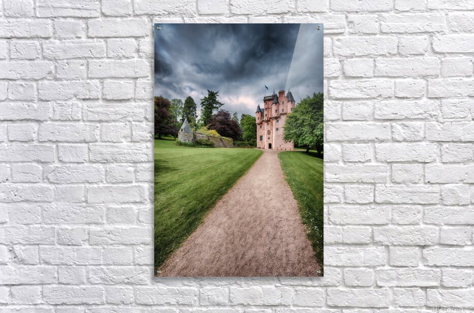 Craigievar Castle rises in soft pink tones against a sky heavy with cloud, its towers and finely sculpted turrets clearly visible at the end of the approach. The straight path draws the eye toward the castle, emphasising the contrast between its lower storey and the delicate details above. Completed in 1626 by Aberdonian merchant William Forbes, Craigievar is a classic example of Scottish Baronial architecture. Its L-plan design, high corbelling, and ornamental gargoyles give the castle a distinctive fairytale appearance, which has remained largely unchanged since it was gifted to the National Trust for Scotland in 1963. This image captures the striking presence and fairytale charm of Craigievar Castle, offering a visually captivating scene for any wall. This image is available as wall art and across a wide range of formats to suit your space or style.