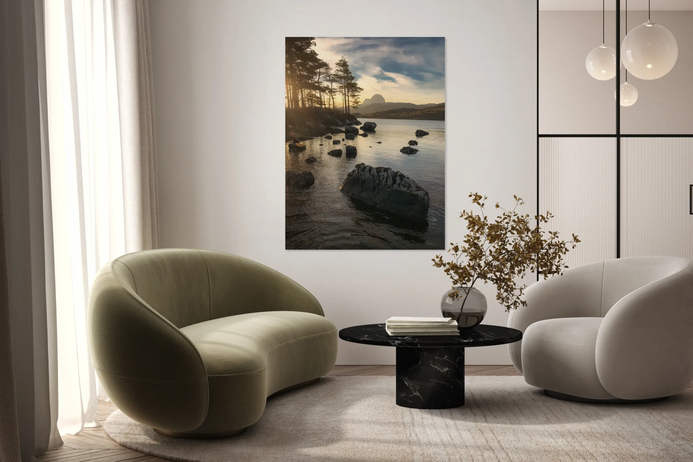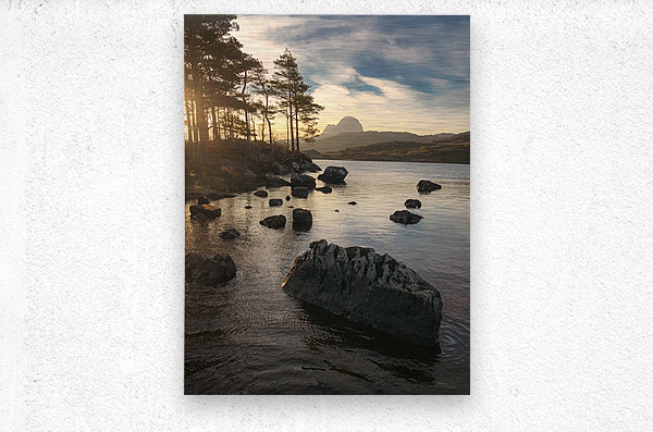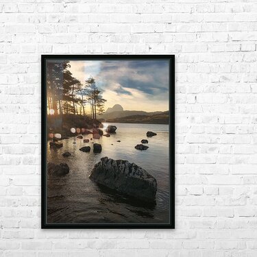 This dawn view looks across Loch Druim Suardalain in the Assynt region of the Scottish Highlands, with the distinctive peak of Suilven rising in the distance. Rocks dot the surface of the loch, while the soft glow of sunrise filters through the trees along the shoreline, adding a quiet sense of depth and atmosphere. Loch Druim Suardalain lies near the village of Lochinver and is known for its scenic beauty, framed by rugged Highland landscapes and dramatic mountain backdrops. The presence of Suilven, one of Scotland’s most iconic mountains, gives this setting a sense of grandeur that is instantly recognisable to those familiar with the region. This image is perfect for anyone who appreciates Highland landscapes, tranquil lochside views, or the rugged beauty of Suilven. It is available as wall art and across a wide range of formats to suit your space or style. Please Note: This image is intentionally presented with a grainy texture as part of its aesthetic.
