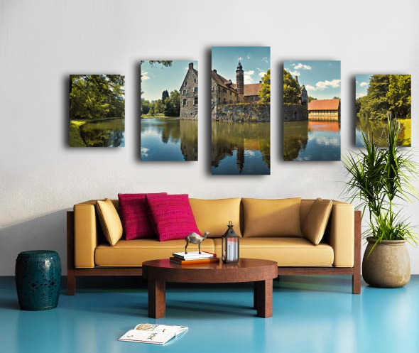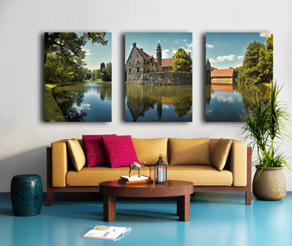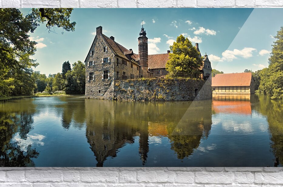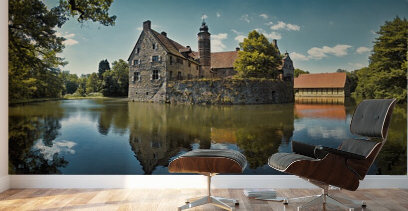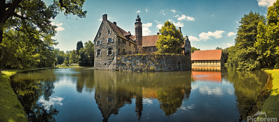 A panoramic view of Vischering Castle in Germany on a clear sunny day with blue sky and scattered clouds above. The moat reflects the castle perfectly giving the scene a calm and open feel. Vischering Castle is one of Germany’s most famous moated castles its architecture surrounded by water and nature. The wide perspective captures both the strength of the building and the quiet beauty of its setting. This image is ideal for anyone with an interest in historic castles German landmarks or European travel memories. It is available as wall art and across a wide range of formats to suit your space or style.