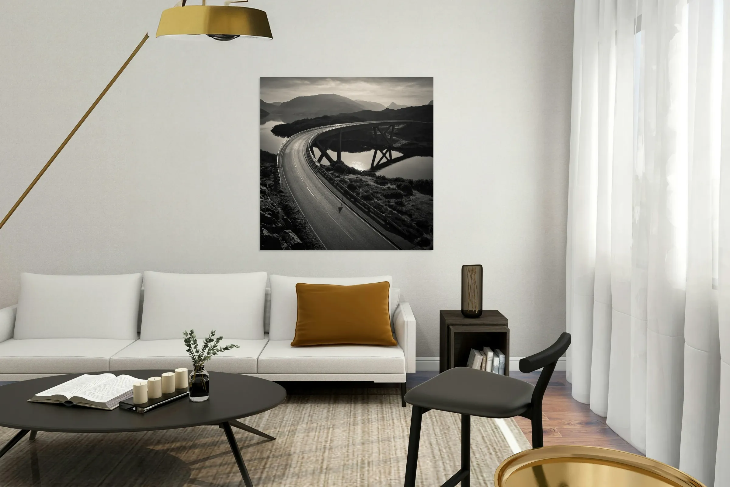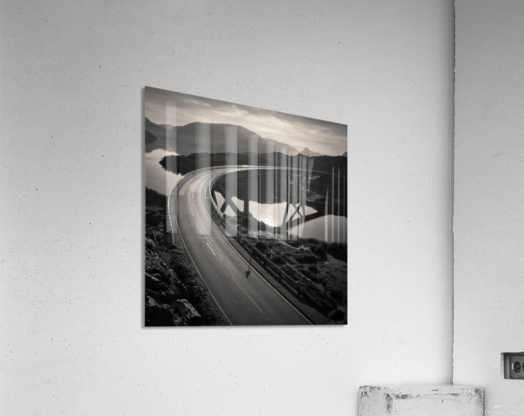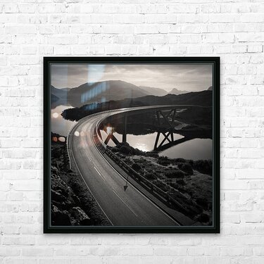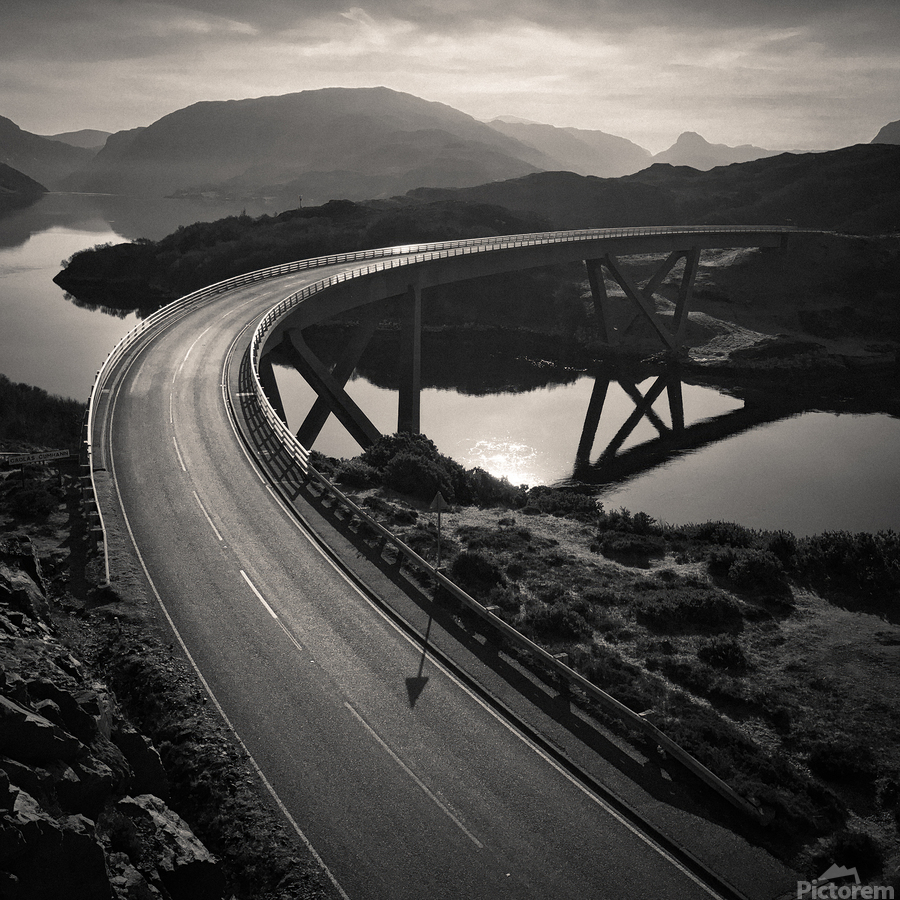 The Kylesku Bridge sweeps in a graceful arc across the waters of Caolas Cumhann its reflection stretching across the still surface below. Set against the rugged Highlands the curve of the bridge feels both dramatic and harmonious drawing the eye through the scene while the surrounding hills fade softly into the distance. The bridge was completed in 1984 replacing the ferry that once carried travellers across the narrows. Today it stands as one of Scotland’s most recognisable modern landmarks a blend of engineering achievement and Highland character. Perfect for anyone drawn to wild landscapes and striking architecture this image brings a piece of the Highlands into your home. It is available as wall art and across a wide range of formats to suit your space or style. Please Note: This image is intentionally presented with a grainy texture as part of its aesthetic.