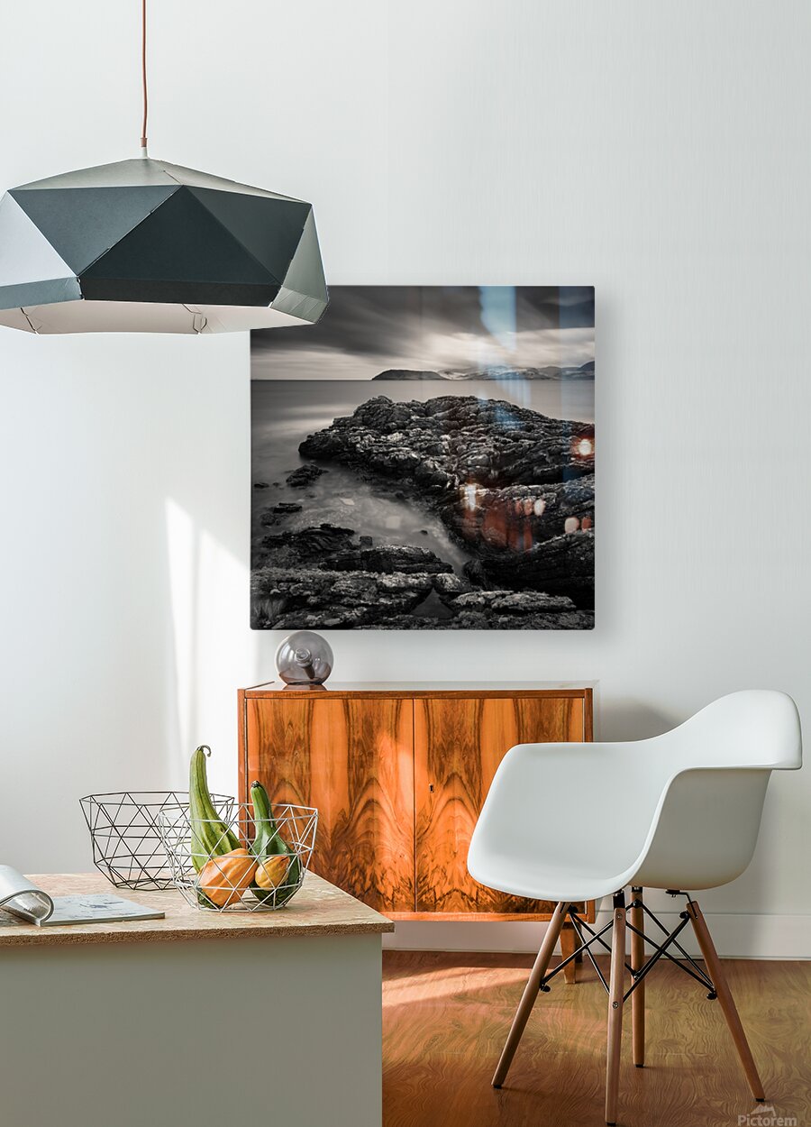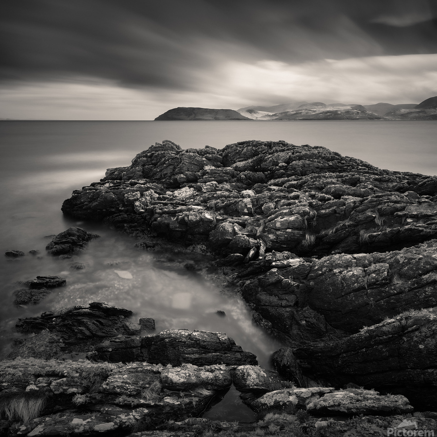 The rugged shoreline of the Kintyre peninsula frames this monochrome view across the Firth of Clyde toward the Isle of Arran. Weathered rocks in the foreground add texture and depth leading the eye across calm waters to the distant silhouette of the island beneath a dramatic sky. The long exposure brings a quiet softness to the scene balancing the solidity of stone against the fleeting movement of cloud and light. Arran often described as “Scotland in miniature” is one of the country’s most beloved islands known for its mountains coastline and timeless character. From the Kintyre side the island appears strikingly bold its outline etched against the horizon as if suspended between sea and sky. This image is perfect for anyone who feels drawn to wild coastlines and the enduring drama of Scotland’s landscapes. It is available as wall art and across a wide range of formats to suit your space or style.