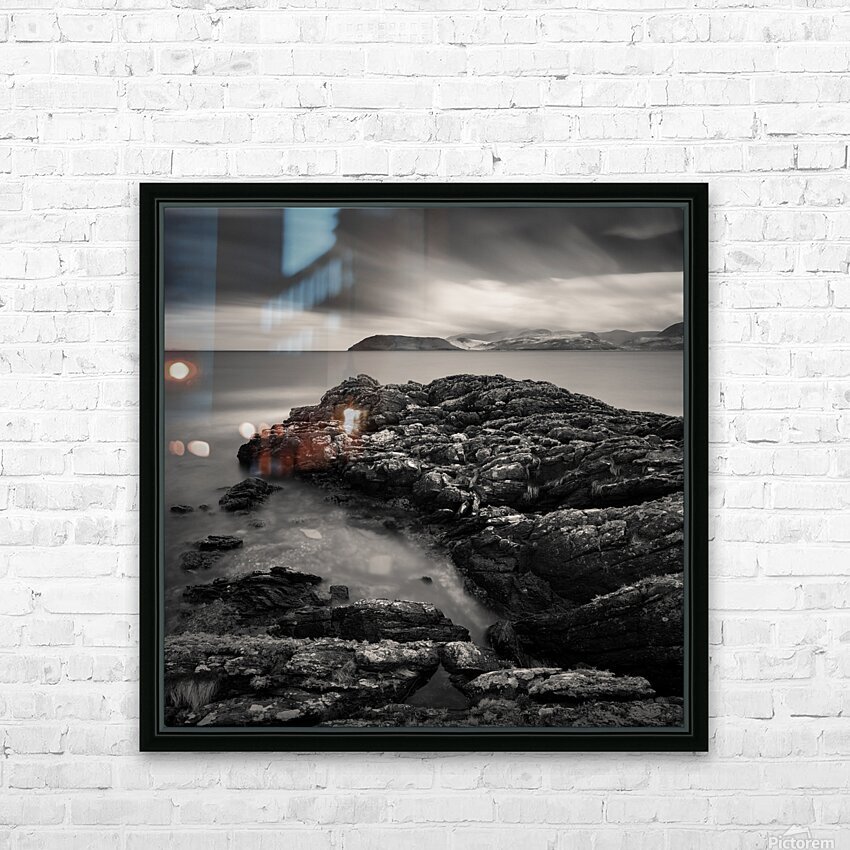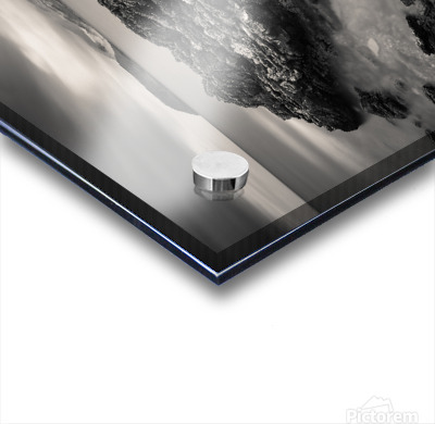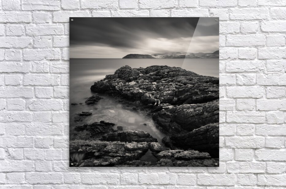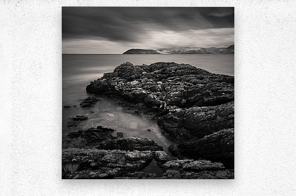 The rugged shoreline of the Kintyre peninsula frames this monochrome view across the Firth of Clyde toward the Isle of Arran. Weathered rocks in the foreground add texture and depth leading the eye across calm waters to the distant silhouette of the island beneath a dramatic sky. The long exposure brings a quiet softness to the scene balancing the solidity of stone against the fleeting movement of cloud and light. Arran often described as “Scotland in miniature” is one of the country’s most beloved islands known for its mountains coastline and timeless character. From the Kintyre side the island appears strikingly bold its outline etched against the horizon as if suspended between sea and sky. This image is perfect for anyone who feels drawn to wild coastlines and the enduring drama of Scotland’s landscapes. It is available as wall art and across a wide range of formats to suit your space or style.