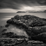 The rugged shoreline of the Kintyre peninsula frames this monochrome view across the Firth of Clyde toward the Isle of Arran. Weathered rocks in the f...[+]