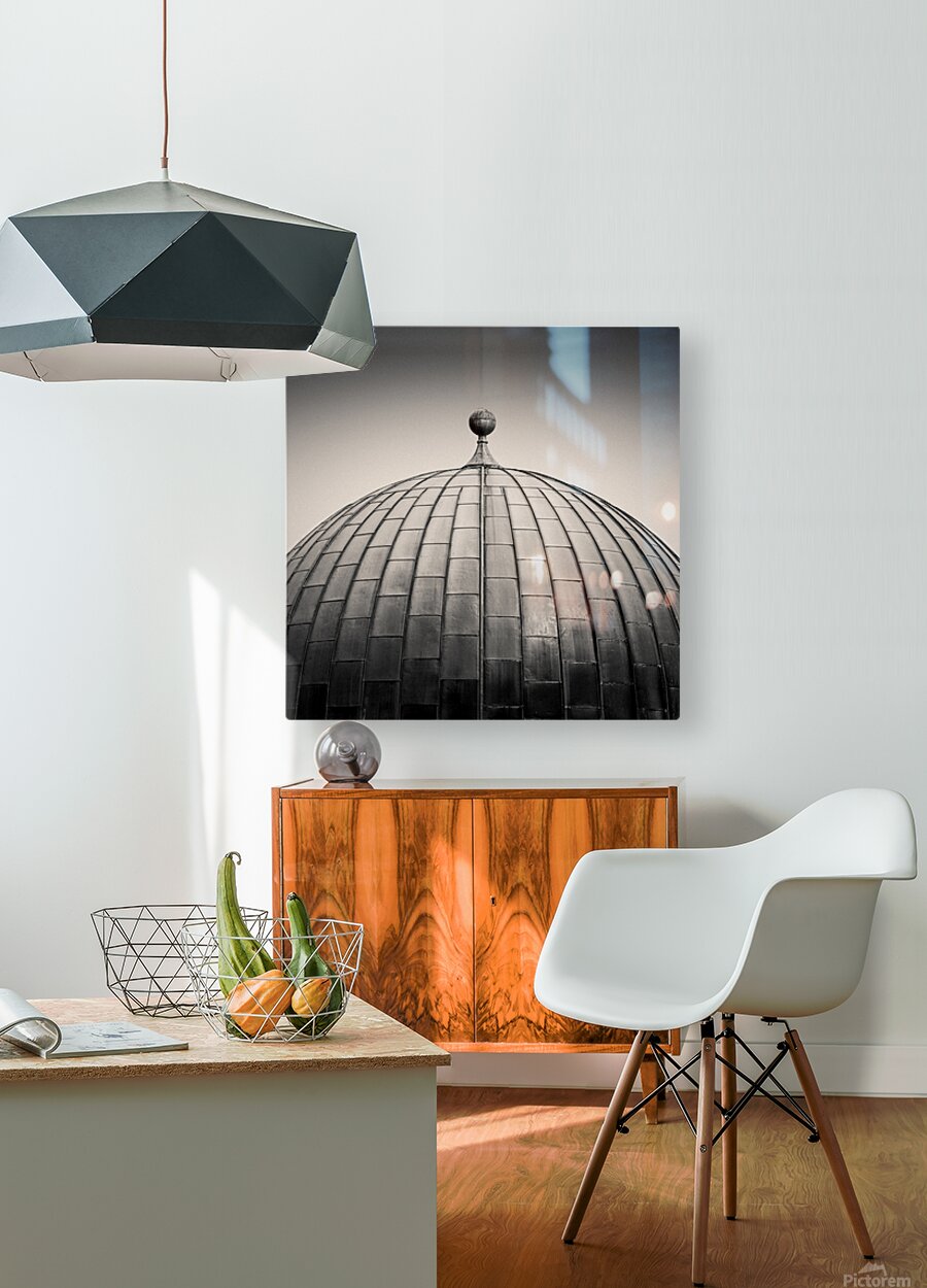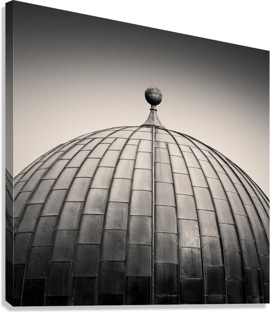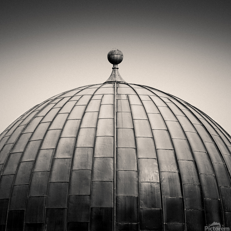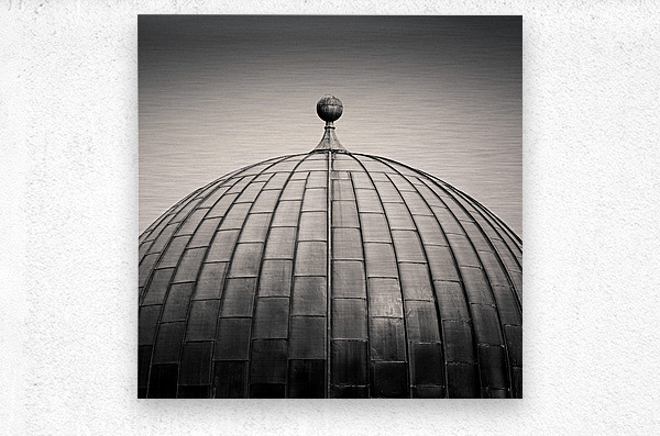 The smooth curve of the Edinburgh Observatory dome rises against a pale sky, its metal panels forming a striking geometric pattern. Captured in monochrome, the scene has a semi-abstract quality that emphasises shape, texture, and symmetry over detail. Situated on Calton Hill, the City Observatory has long been a landmark in Edinburgh, Scotland. Built in the early 19th century, it reflects both scientific heritage and architectural design, with its distinctive dome instantly recognisable to those who know the city. A great photograph for lovers of clean geometry, architectural detail, and Edinburgh landmarks. This image is available as wall art and across a wide range of formats to suit your space or style. ..... Please Note: This image is intentionally presented with a grainy texture as part of its aesthetic.