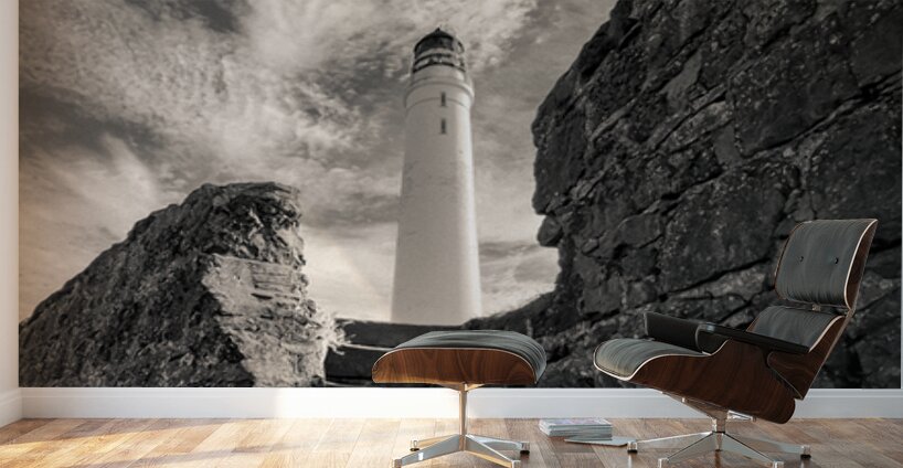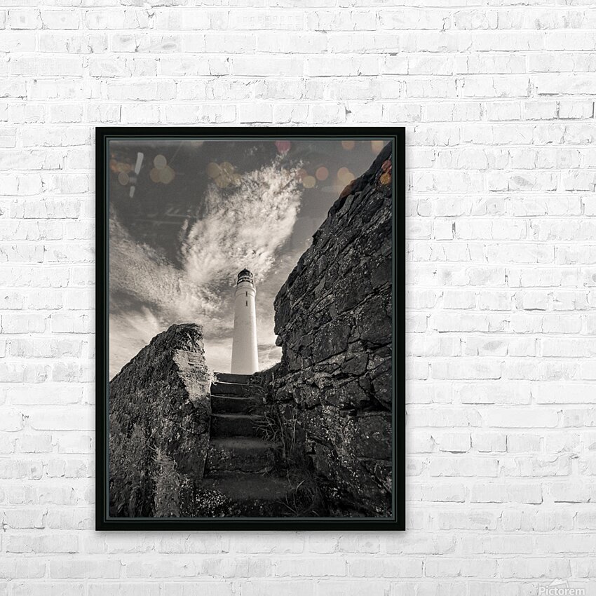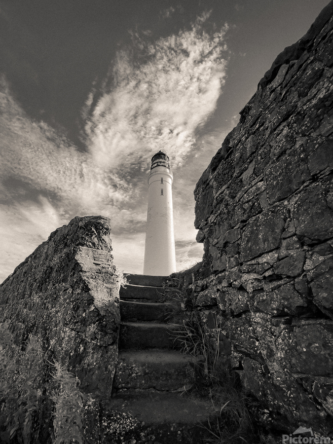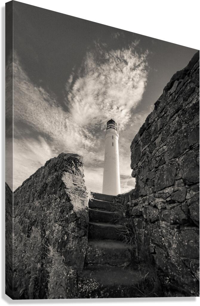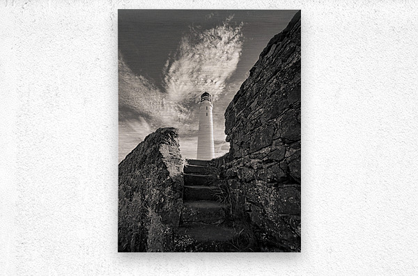 Weathered stone steps climb from the shoreline towards the Scurdie Ness Lighthouse in Montrose Scotland. The view is framed by rugged walls on either side drawing the eye upward to the tall white tower set against a textured sky streaked with drifting clouds. Built in the 19th century Scurdie Ness Lighthouse has guided mariners safely along the Angus coast for generations. Its location at the mouth of the River South Esk made it a vital landmark for navigation and today it remains an enduring feature of Montrose’s coastal heritage. A great photograph for anyone who appreciates maritime history dramatic coastal architecture or the striking presence of lighthouses. This image is available as wall art and across a wide range of formats to suit your space or style. ..... Please Note: This image is intentionally presented with a grainy texture as part of its aesthetic.