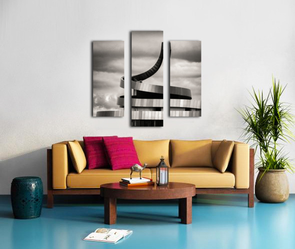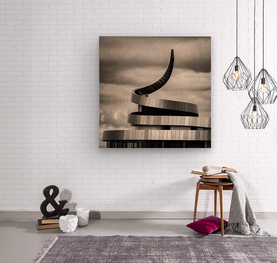 The striking rooftop of the W Edinburgh hotel rises in a sweeping spiral form that twists dramatically against a backdrop of heavy cloud. Its curved metallic panels catch the light in shifting tones creating a bold contrast with the moody sky. The design feels both sculptural and architectural blending modern creativity with dynamic presence. This unique rooftop feature often referred to as the “walnut whip” has quickly become one of Edinburgh’s most distinctive modern landmarks. Sitting at the heart of the St James Quarter it stands in deliberate contrast to the city’s historic stone architecture marking the area as a centre of contemporary design and development. Perfect for admirers of architectural photography and modern design this image highlights the tension between tradition and innovation within Edinburgh’s evolving skyline. This image is available as wall art and across a wide range of formats to suit your space or style. ..... Please Note: This image is intentionally presented with a grainy texture as part of its aesthetic.