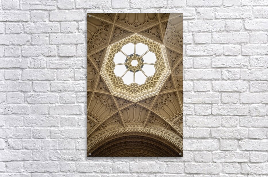 The ornate and intricately detailed ceiling above the Grand Staircase inside Penrhyn Castle near Bangor in North Wales. The view looks up into an octagonal skylight framed by elaborate Gothic Revival stonework where repeating patterns arches and sculpted details converge in a striking display of craftsmanship. The rich geometry and precise symmetry create a dramatic architectural study highlighting the opulence and ambition of 19th-century design. It’s a perspective that draws the eye upward celebrating the artistry and structural mastery behind one of the castle’s most impressive interiors. This image is available as wall art and across a wide range of formats to suit your space or style.