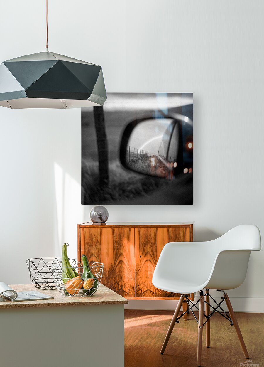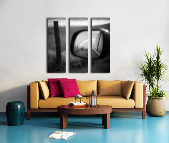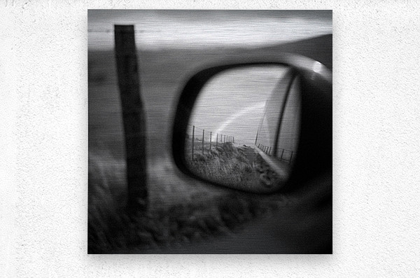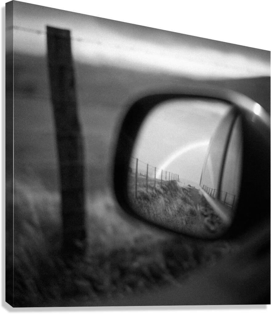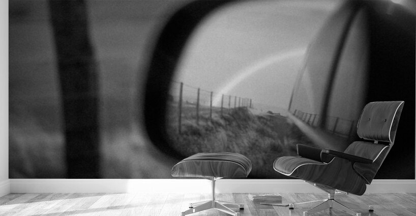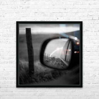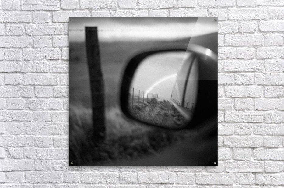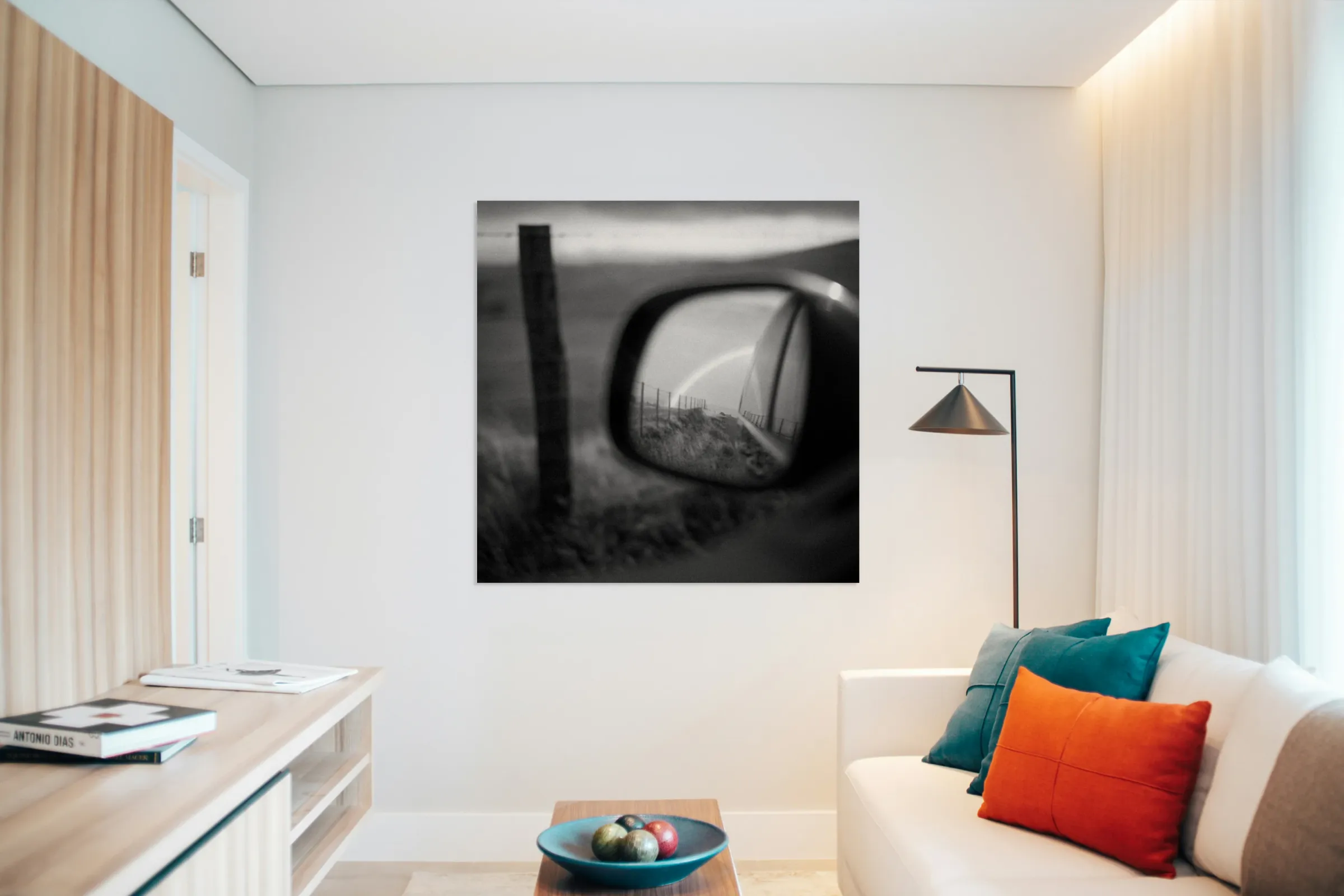 A fleeting rainbow arches across the sky in the rearview mirror captured along a remote road in North Wales. The subtle reflection contrasts beautifully with the surrounding landscape where open fields and weathered fencing hint at the rugged isolation of the location. The perspective transforms a simple roadside moment into something more poetic with the mirror’s frame acting as a window to a passing scene behind a reminder of transient beauty glimpsed on life’s journeys. The monochrome treatment enhances the sense of stillness and reflection stripping the scene back to its essential shapes and textures. This image is available as wall art and across a wide range of formats to suit your space or style and makes a thoughtful piece for those drawn to minimalist compositions quiet landscapes and the beauty of fleeting moments. ..... Please Note: This image is intentionally presented with a grainy texture as part of its aesthetic.