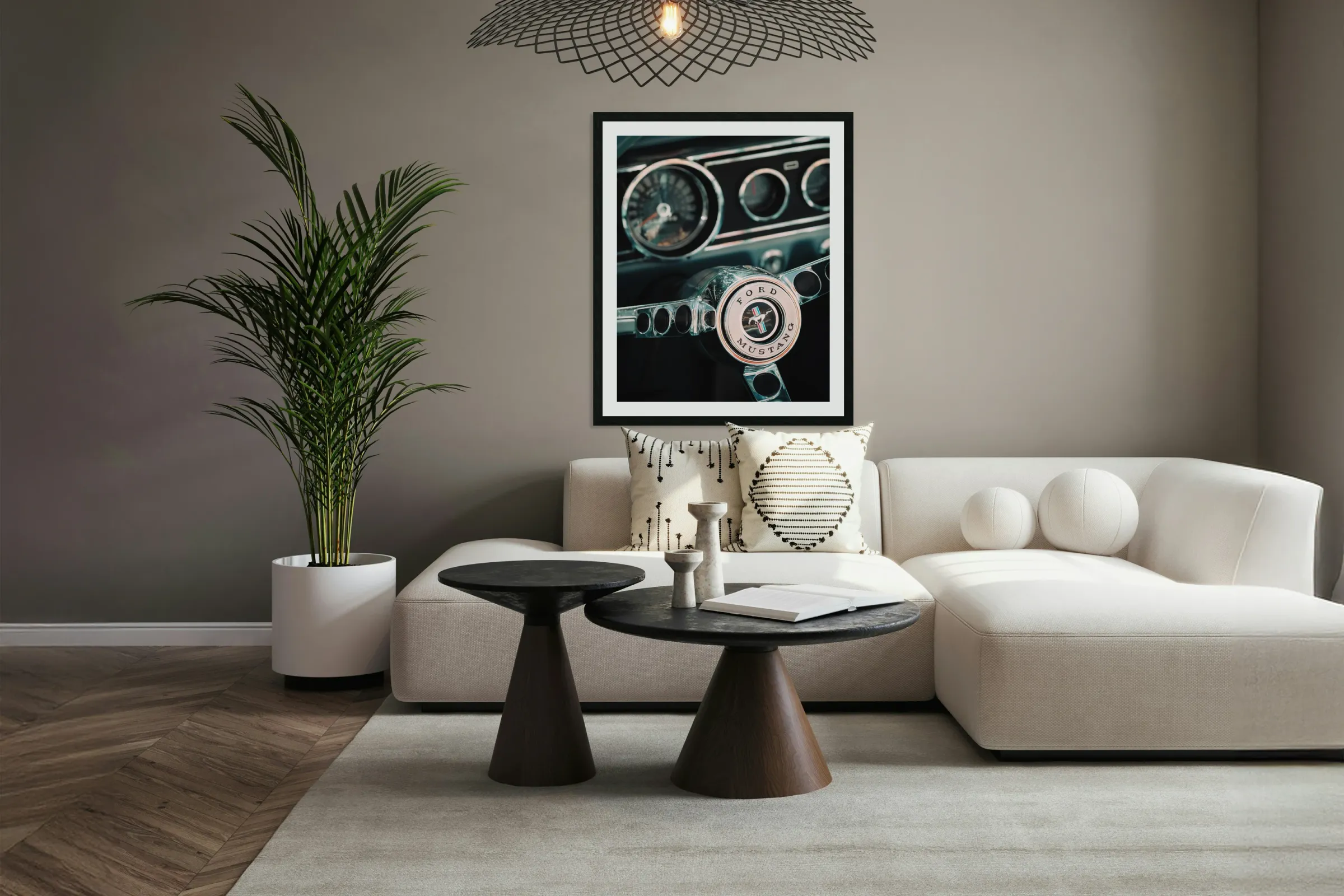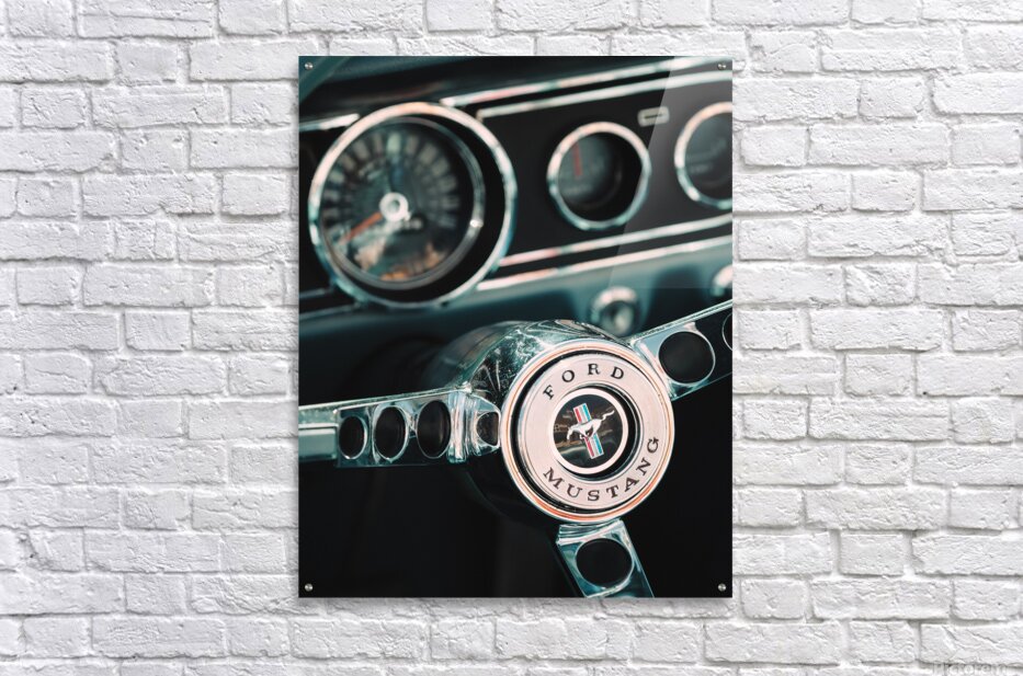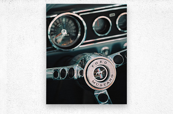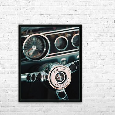 The steering column and dashboard of a vintage Ford Mustang fill the frame showcasing the classic design and detailing of the iconic American muscle car. Gauges knobs and the steering wheel are captured clearly highlighting the craftsmanship and character of the interior. The Ford Mustang has been an enduring symbol of performance and style since its introduction in the 1960s. Its dashboard design reflects the era’s focus on driver experience combining functionality with a distinctive retro aesthetic that continues to captivate car enthusiasts. This image is perfect for vintage car lovers Mustang enthusiasts or anyone drawn to classic automotive design. It is available as wall art and across a wide range of formats to suit your space or style.