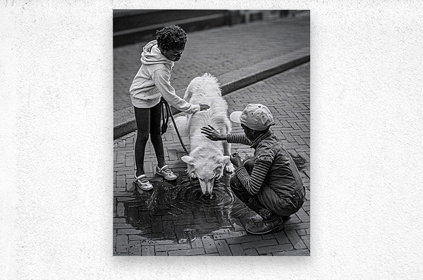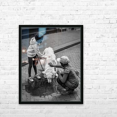 Watering Hole captures a quiet, tender moment as two children pause to stroke a white dog drinking from a puddle. The scene celebrates simple acts of care, highlighting the small, everyday gestures that make life gentle and human. It’s a candid glimpse into everyday city life, where ordinary moments reveal the subtle beauty of kindness. Grounded in the innocence of childhood and the joy of caring for another living being, the photograph invites viewers to pause and appreciate the quiet generosity found in fleeting interactions. This image is available as wall art and across a wide range of formats to suit your space or style.