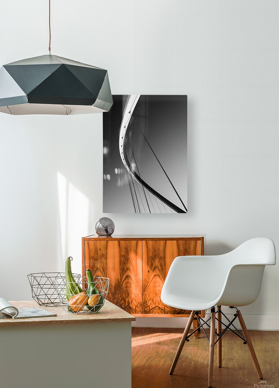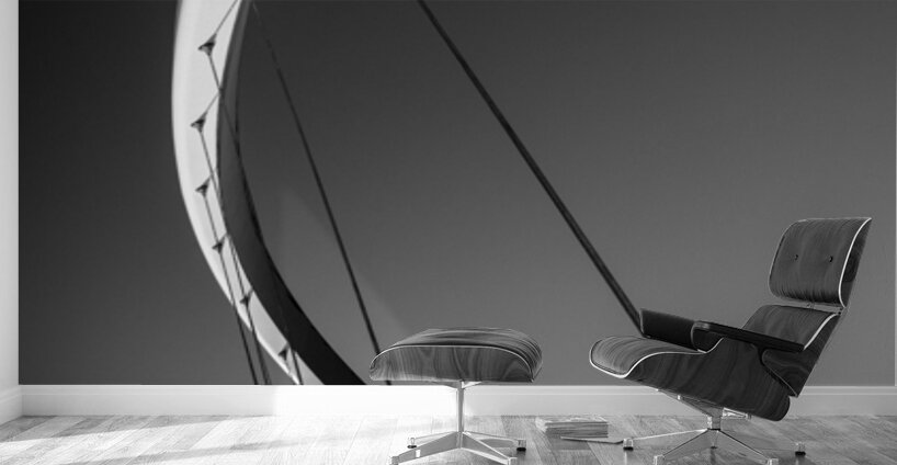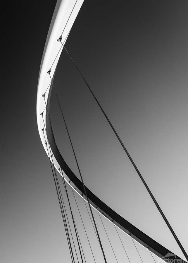 The sweeping arc of the Gateshead Millennium Bridge cuts gracefully through the frame its bold lines taut cables and smooth curves creating a striking piece of abstract geometry. Stripped of detail and reduced to pure form the structure becomes a study in balance and movement standing out sharply against the soft gradient of the sky. Spanning the River Tyne between Gateshead and Newcastle this award-winning tilting bridge is one of the UK’s most celebrated pieces of modern engineering. Opened in 2001 its innovative design allows the entire structure to tilt like a giant eyelid providing both a pedestrian crossing and a dynamic sculptural landmark that reflects the region’s spirit of innovation. A perfect photograph for lovers of modern architecture minimalist design or striking geometric compositions. This image is available as wall art and across a wide range of formats to suit your space or style.