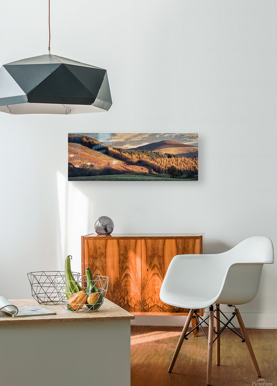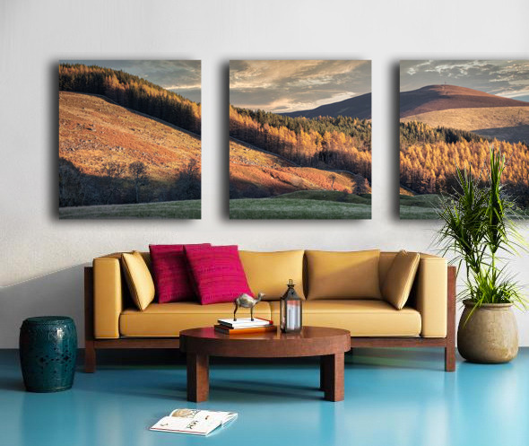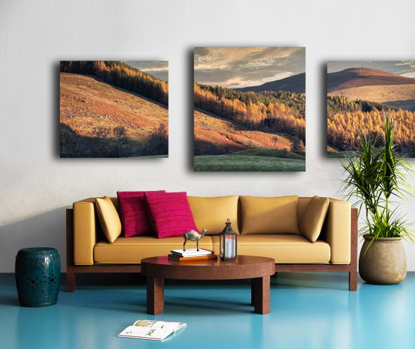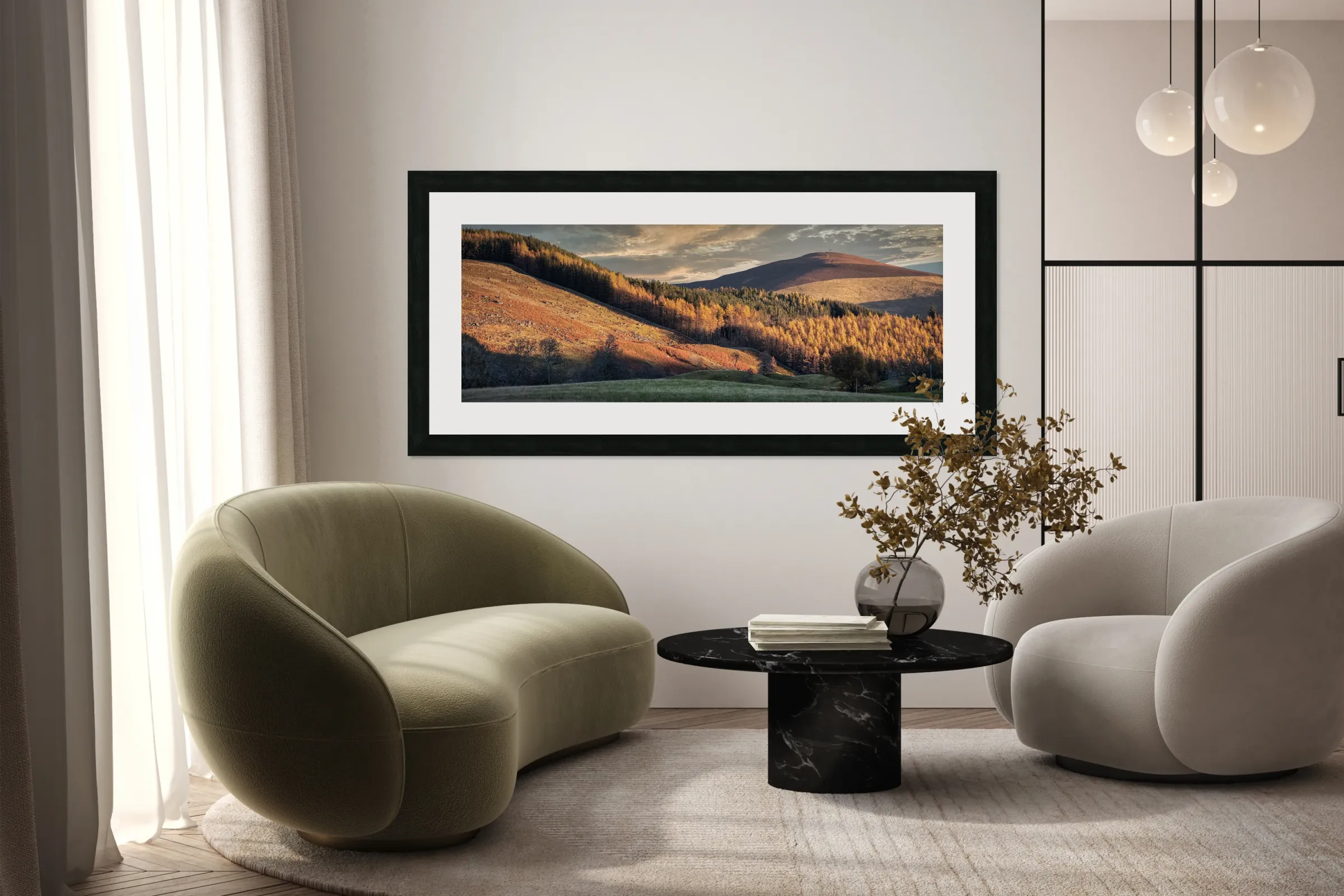 Warm evening light sweeps across the rolling slopes of Glenshee turning the larch and pine forests into a tapestry of gold and amber. The play of sunlight and shadow across the hillside reveals the layered textures of grass trees and heather while the distant mountain rises quietly under a sky streaked with soft cloud. The whole scene feels calm and unhurried caught in the stillness of a fading Highland day. Set in the heart of the Cairngorms National Park Glenshee is one of Scotland’s most dramatic mountain glens known for its sweeping valleys and ever-changing seasonal colours. In autumn the landscape glows with warmth as the low sun transforms the slopes into shades of copper and rust offering a striking contrast to the darker forests below. A perfect photograph for those who love the quiet majesty of the Scottish Highlands and the beauty of light over land. This image is available as wall art and across a wide range of formats to suit your space or style.