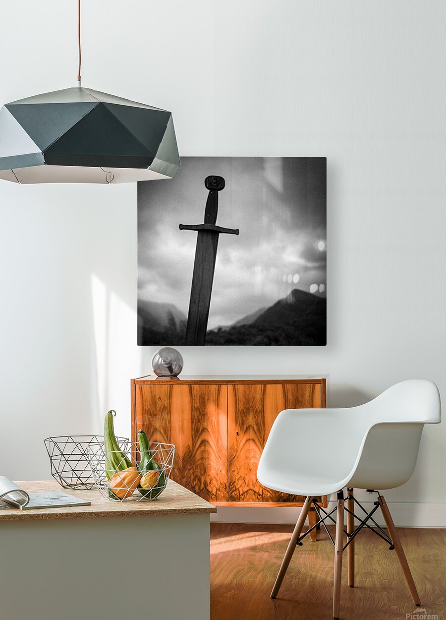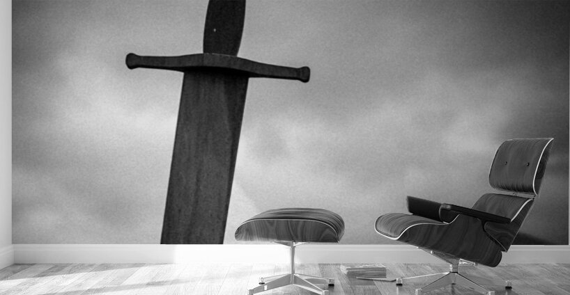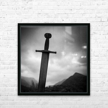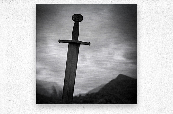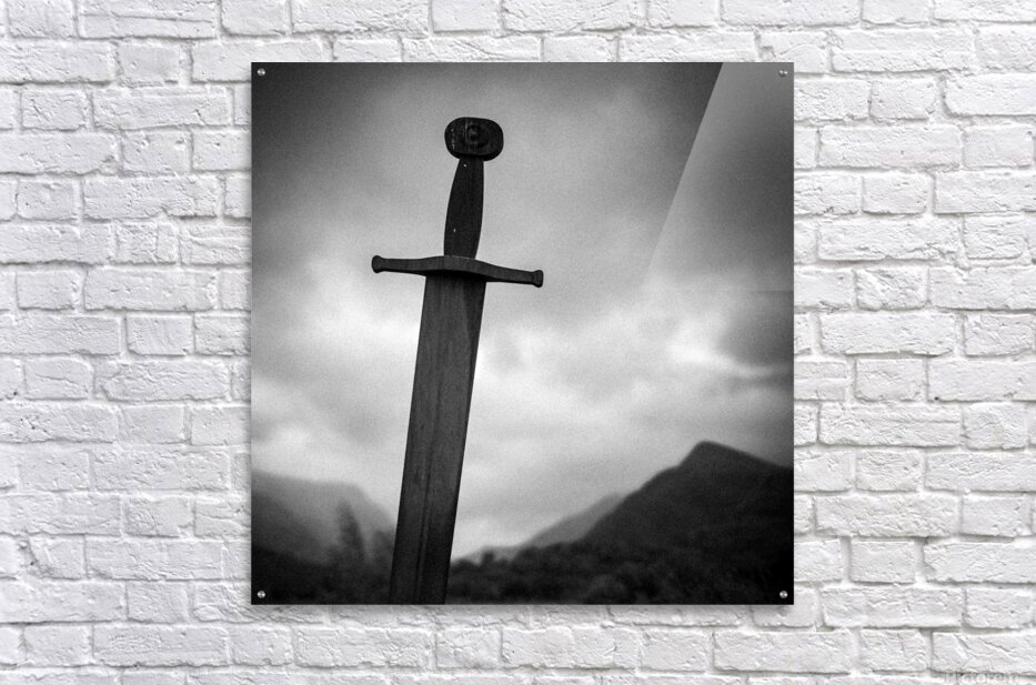 Set against the brooding mountain backdrop of Llanberis in North Wales the Blade of the Giants stands tall and solemn its weathered form silhouetted against a dramatic sky. This striking sculpture evokes echoes of legend and myth a monumental symbol of strength and timelessness rooted in the rugged Welsh landscape. The stark composition and monochrome tones heighten its presence lending a cinematic quality that blurs the line between history and imagination. The imposing sword seems to anchor the scene as if it has stood guard here for centuries watching over the valleys below. This image is available as wall art and across a wide range of formats to suit your space or style and makes a powerful statement piece for lovers of mythic landscapes Celtic heritage and dramatic outdoor scenes. ..... Please Note: This image is intentionally presented with a grainy texture as part of its aesthetic.